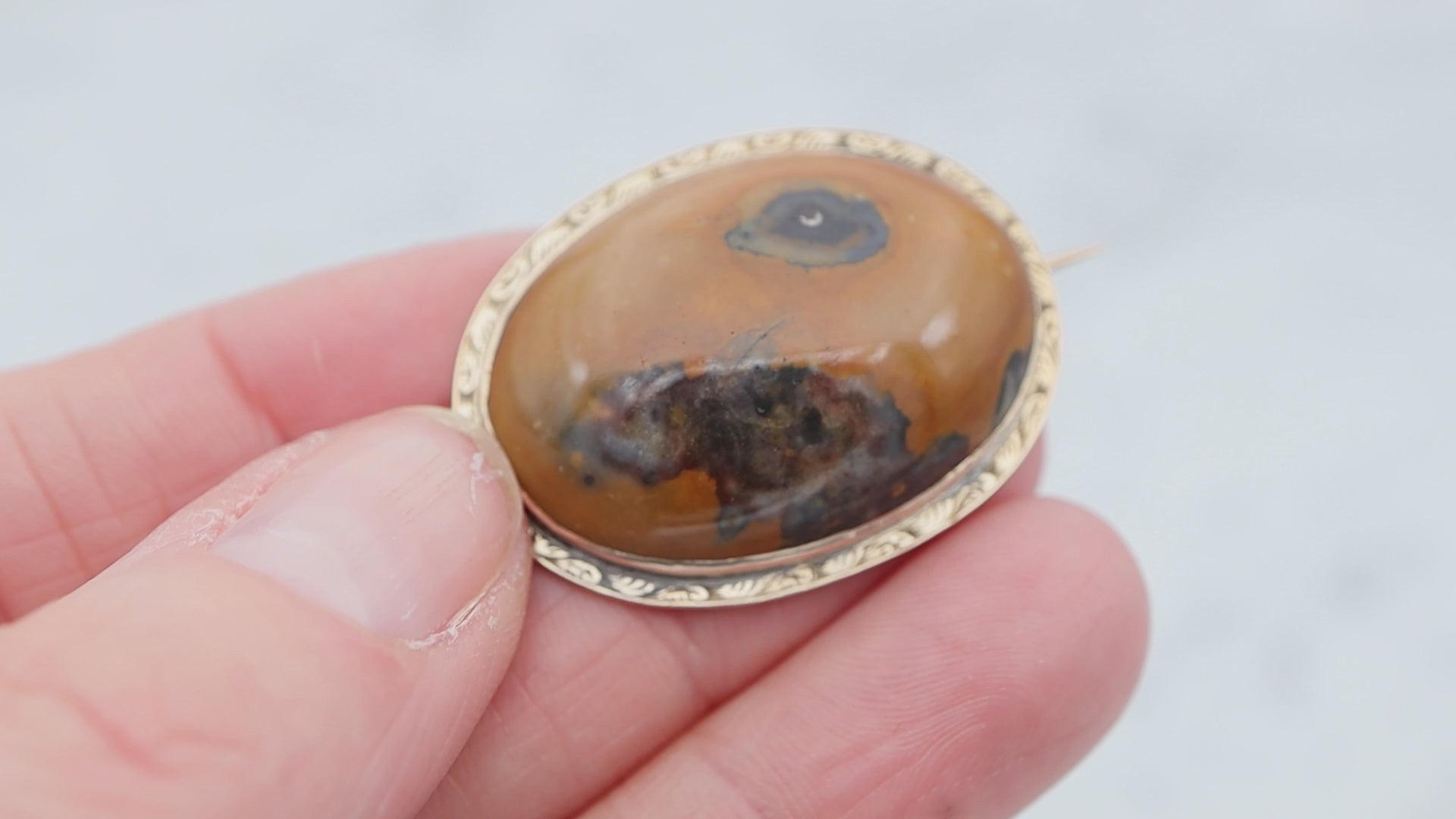 This Victorian era brooch features a large oval cabochon of rich yellow jasper with brown & black inclusions, bezel set in a hand etched 10k gold frame.