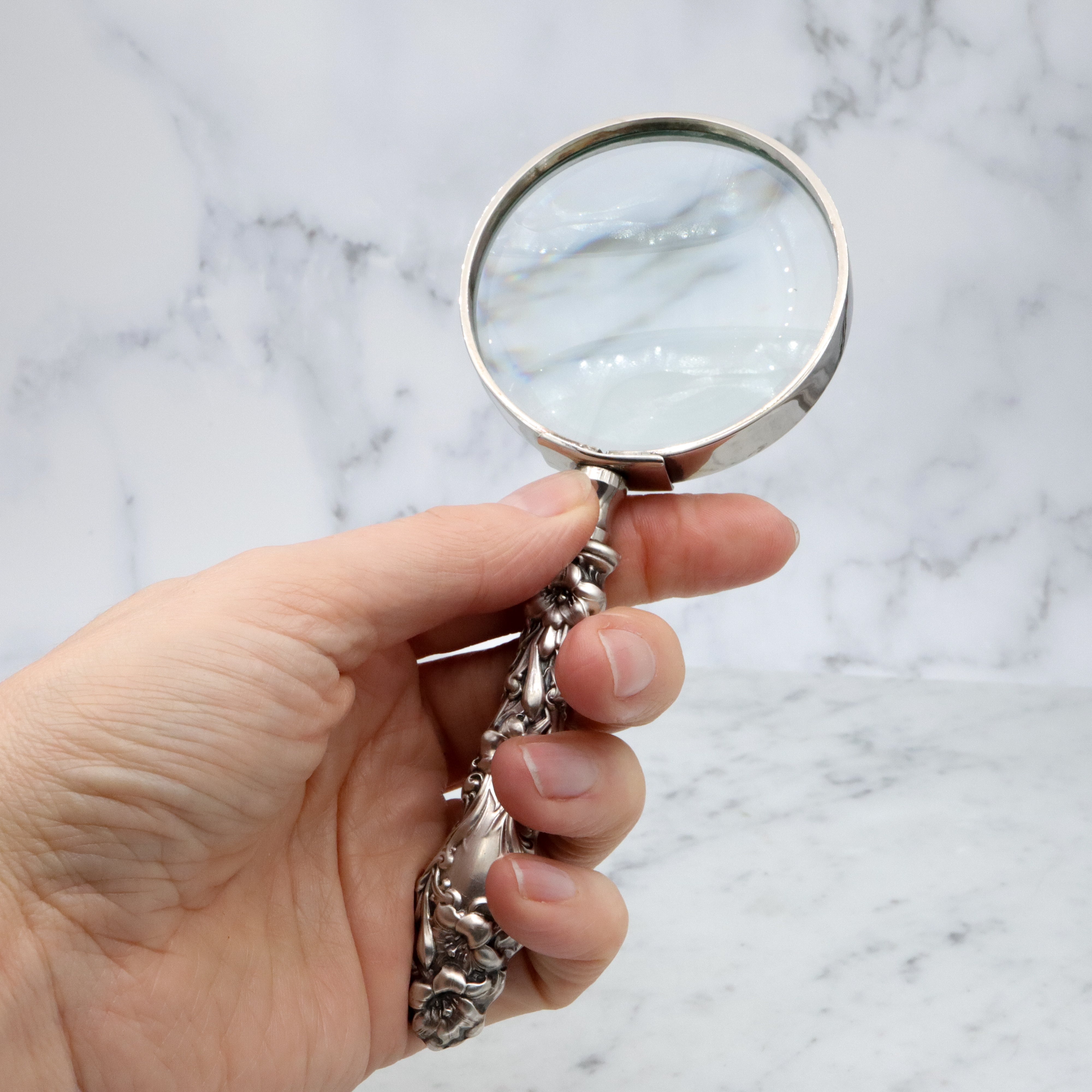 This substantial antique magnifying glass has a weighted sterling silver handled by Whiting in the Lily pattern featuring Art Nouveau styled embossed lily flowers and leaves; the glass section is domed on both sides and has a blue tint.
