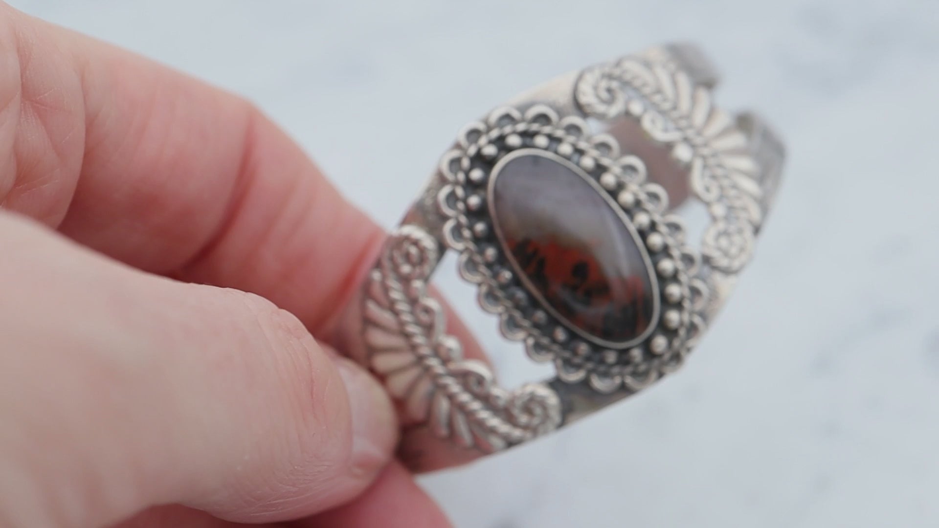 This vintage sterling silver Navajo handmade cuff bracelet features an oval cabochon of agate with grey, black, and red, bordered by an applied bead frame.