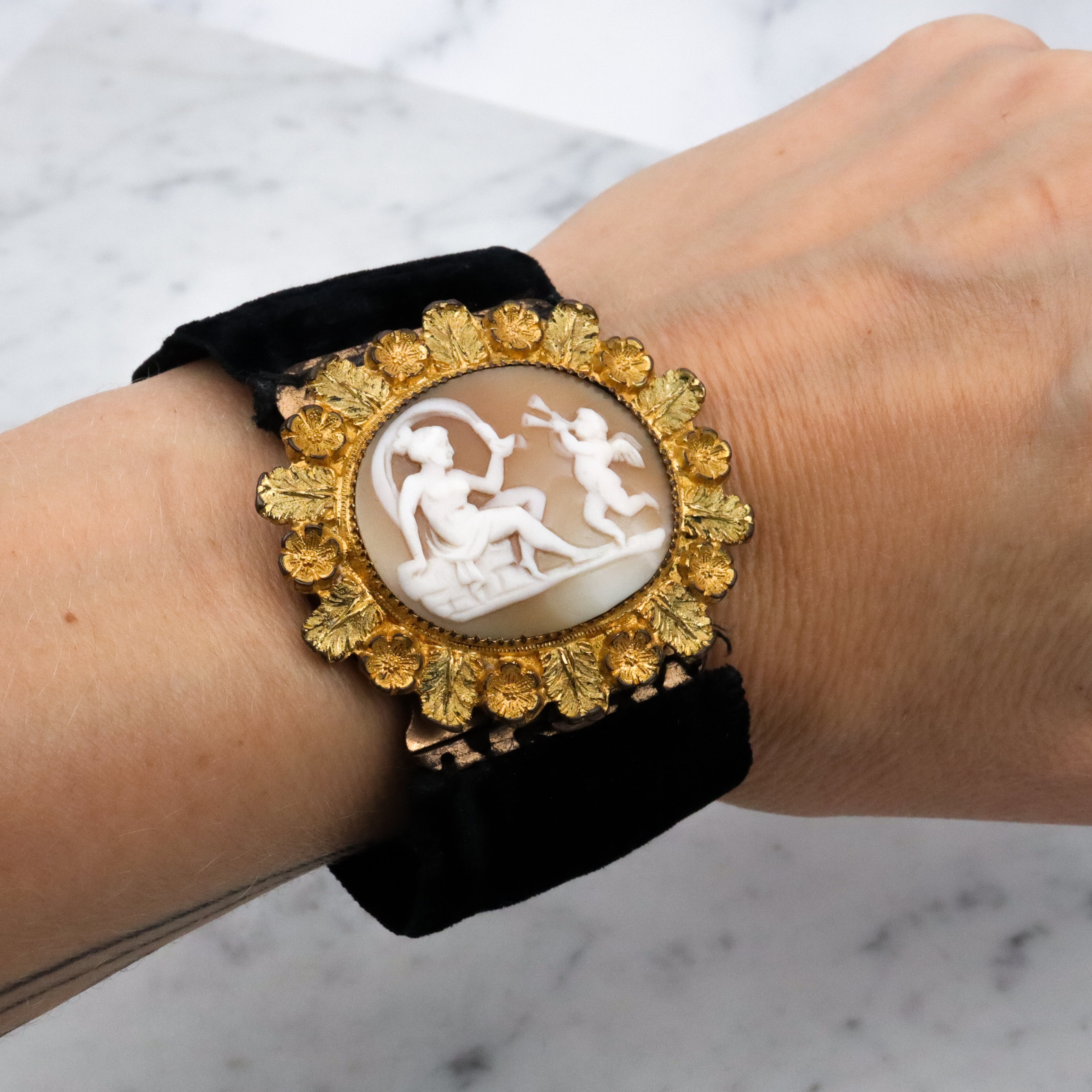 Antique Victorian Venus & Cupid gilt metal foliate framed cameo with velvet ribbon bracelet