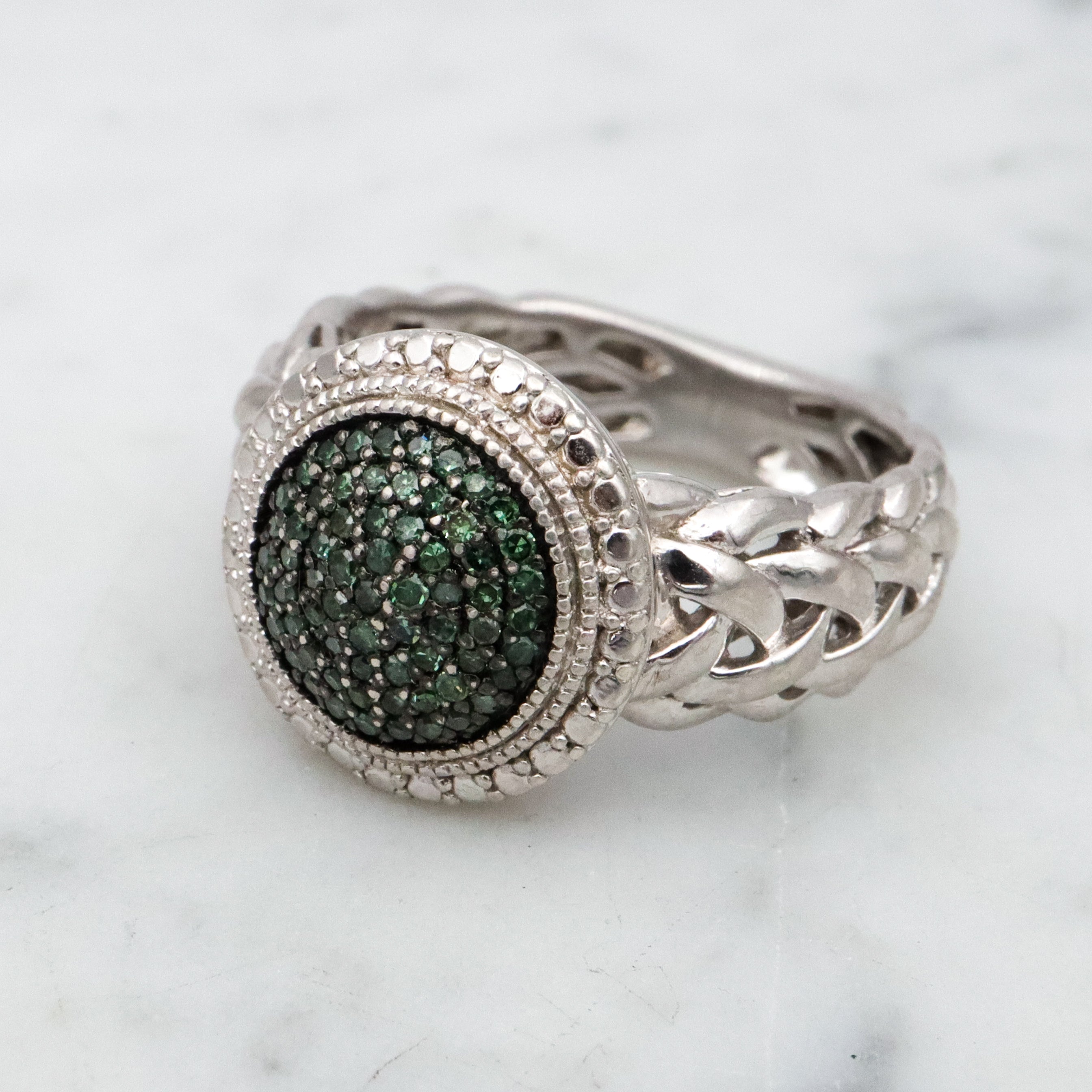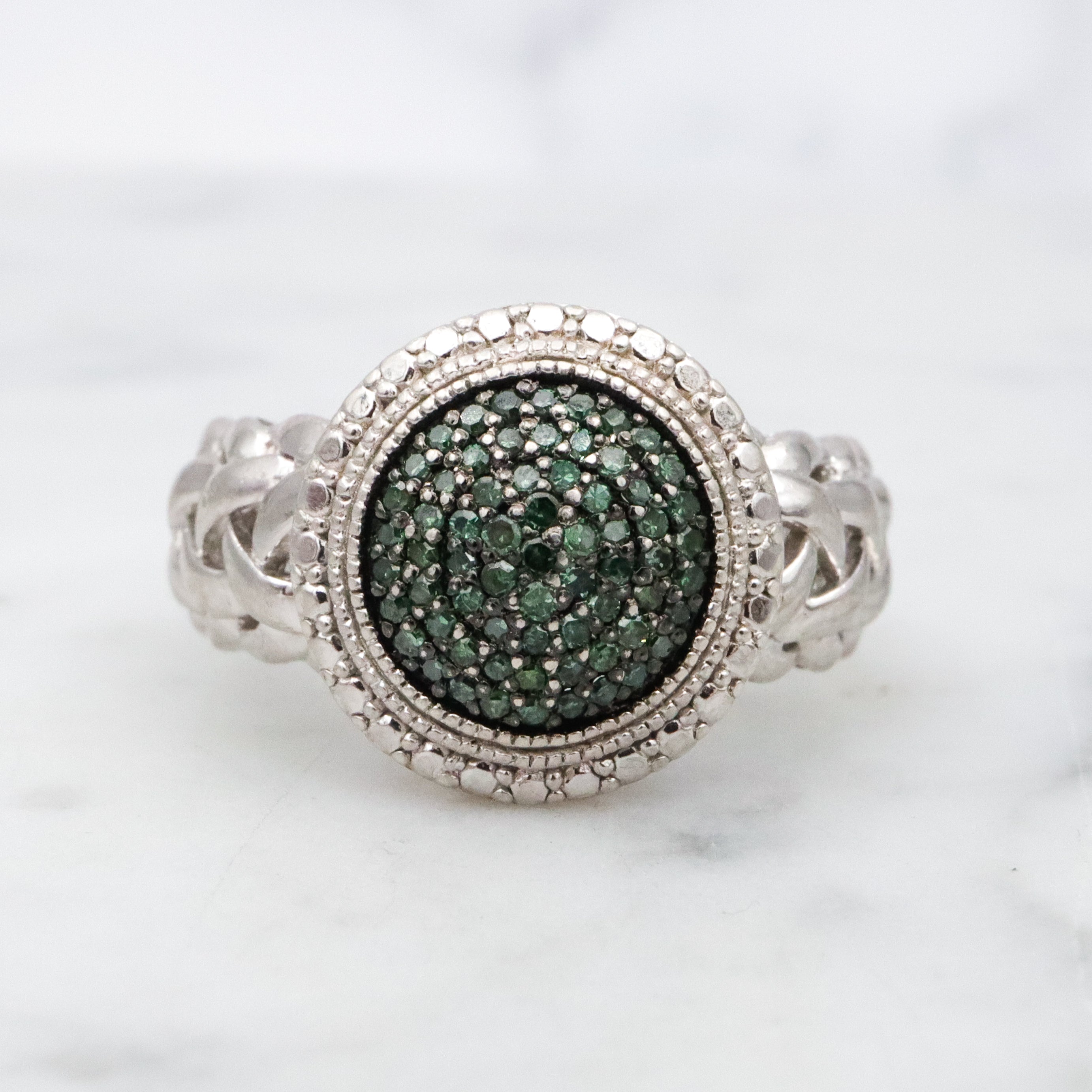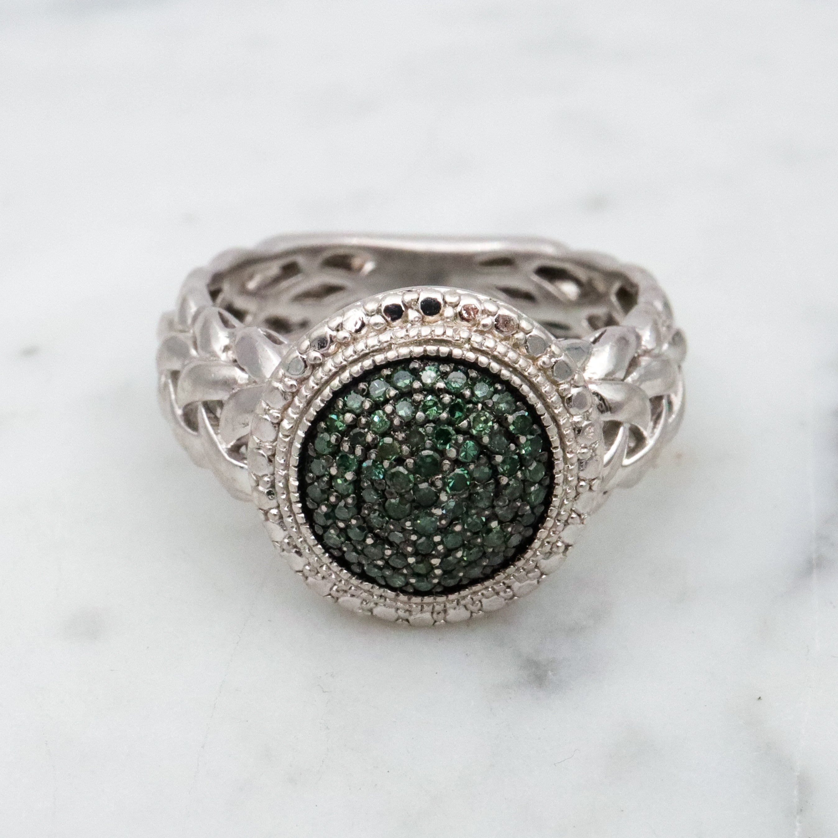 Retro Joseph Schmid green diamond braided sterling ring, size 8