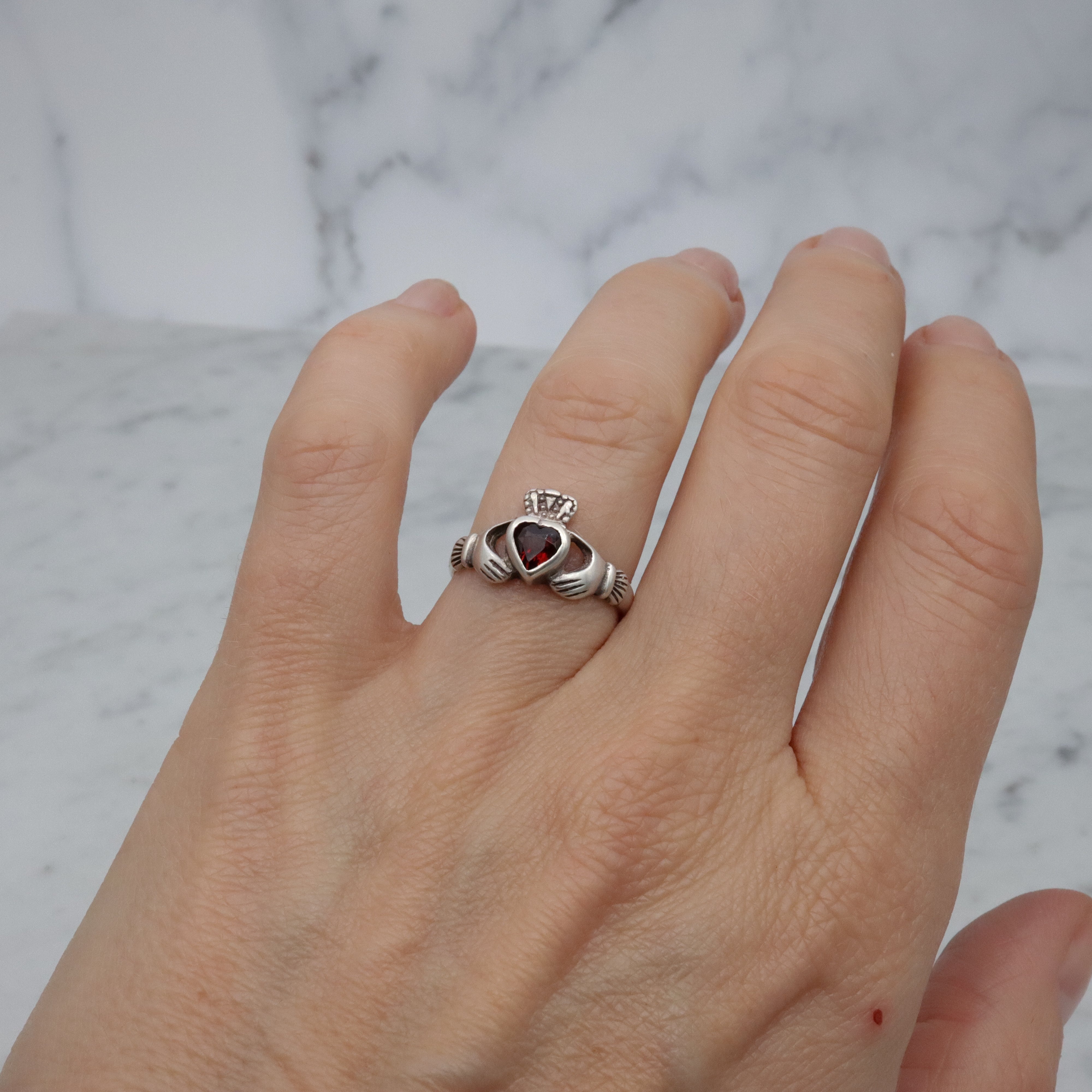 Vintage Irish sterling garnet Claddagh ring, size 7.25