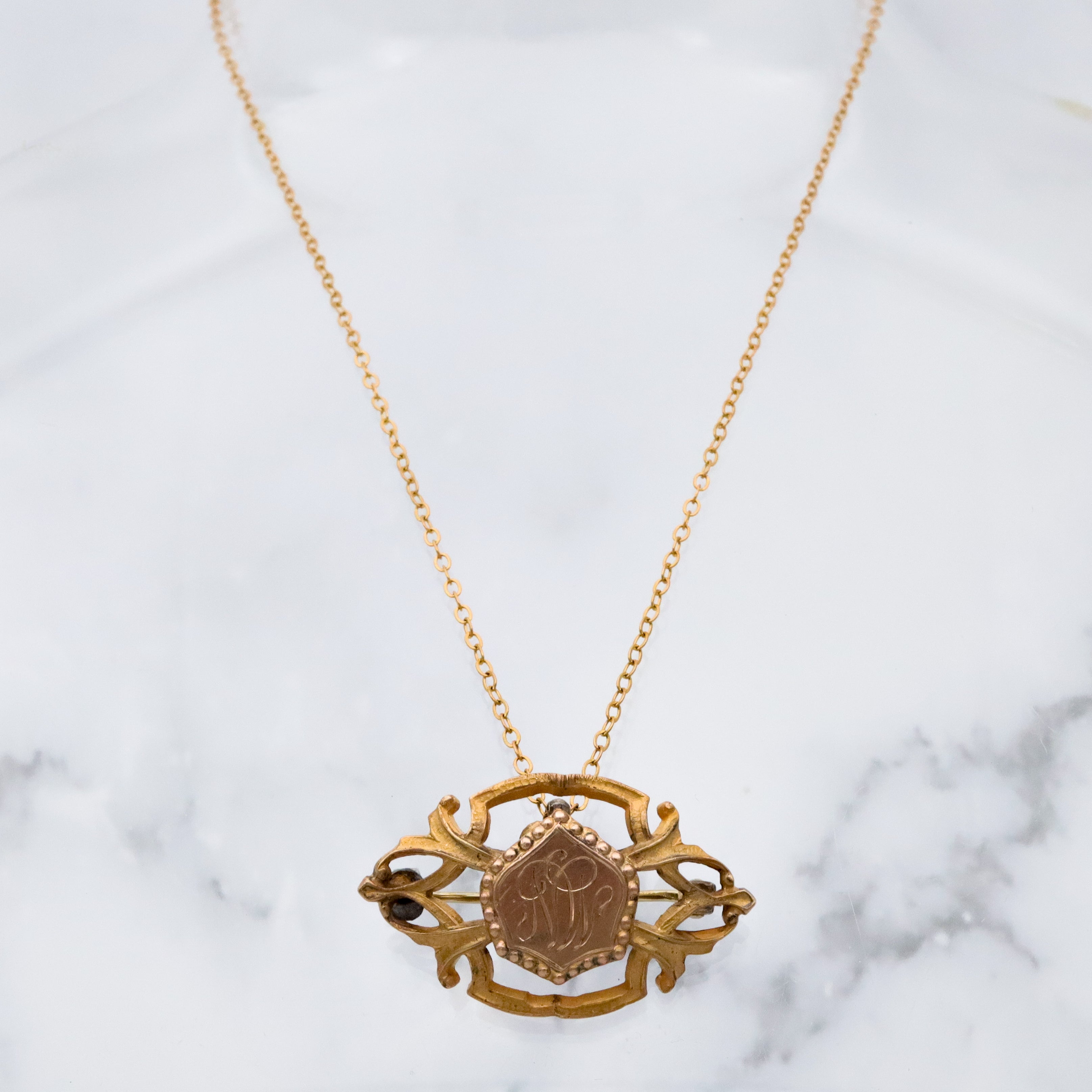Antique Art Deco gilt metal & gold filled watch clip brooch with "MN" mono shield