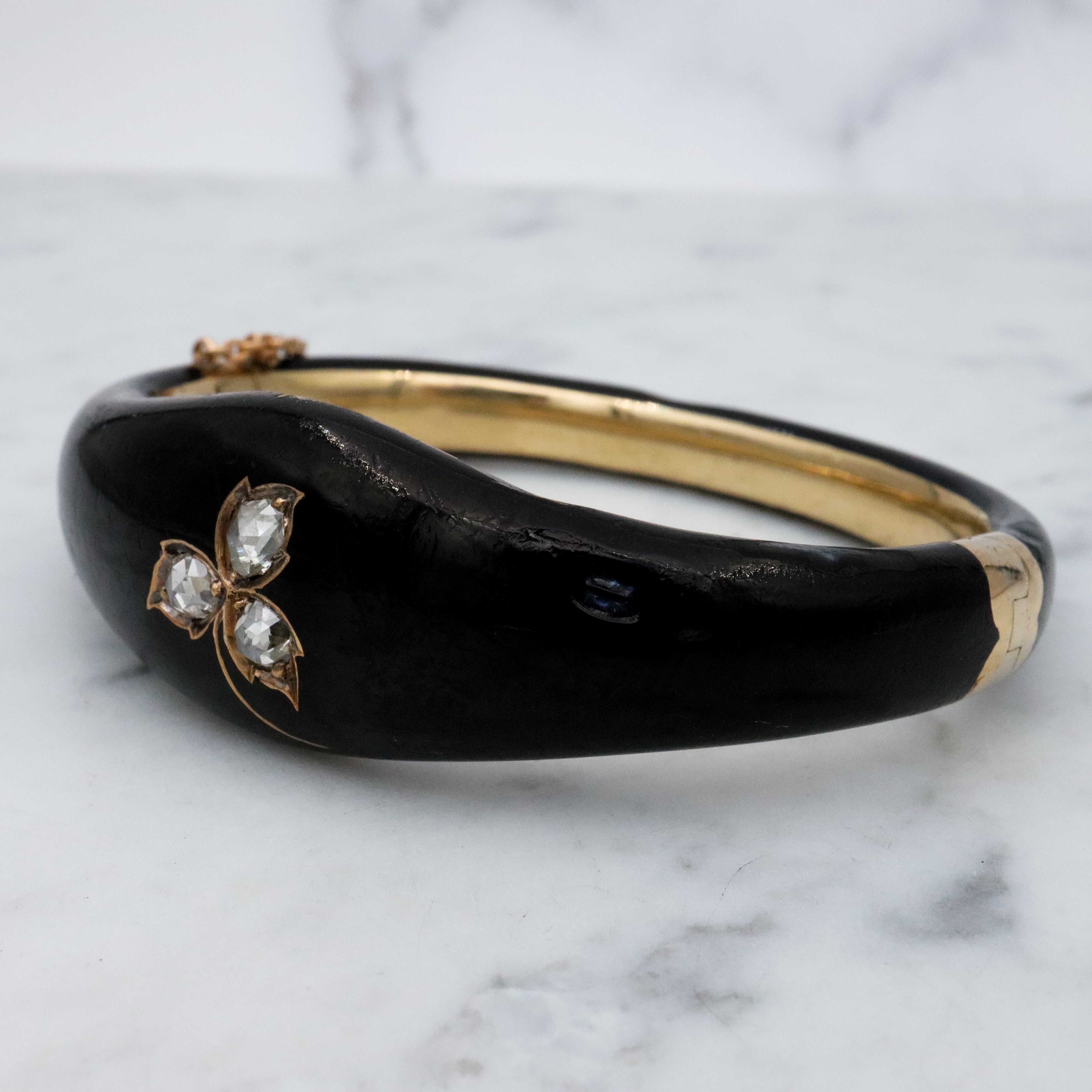 Antique Victorian 14k gold black enamel mourning bangle with rose cut diamonds