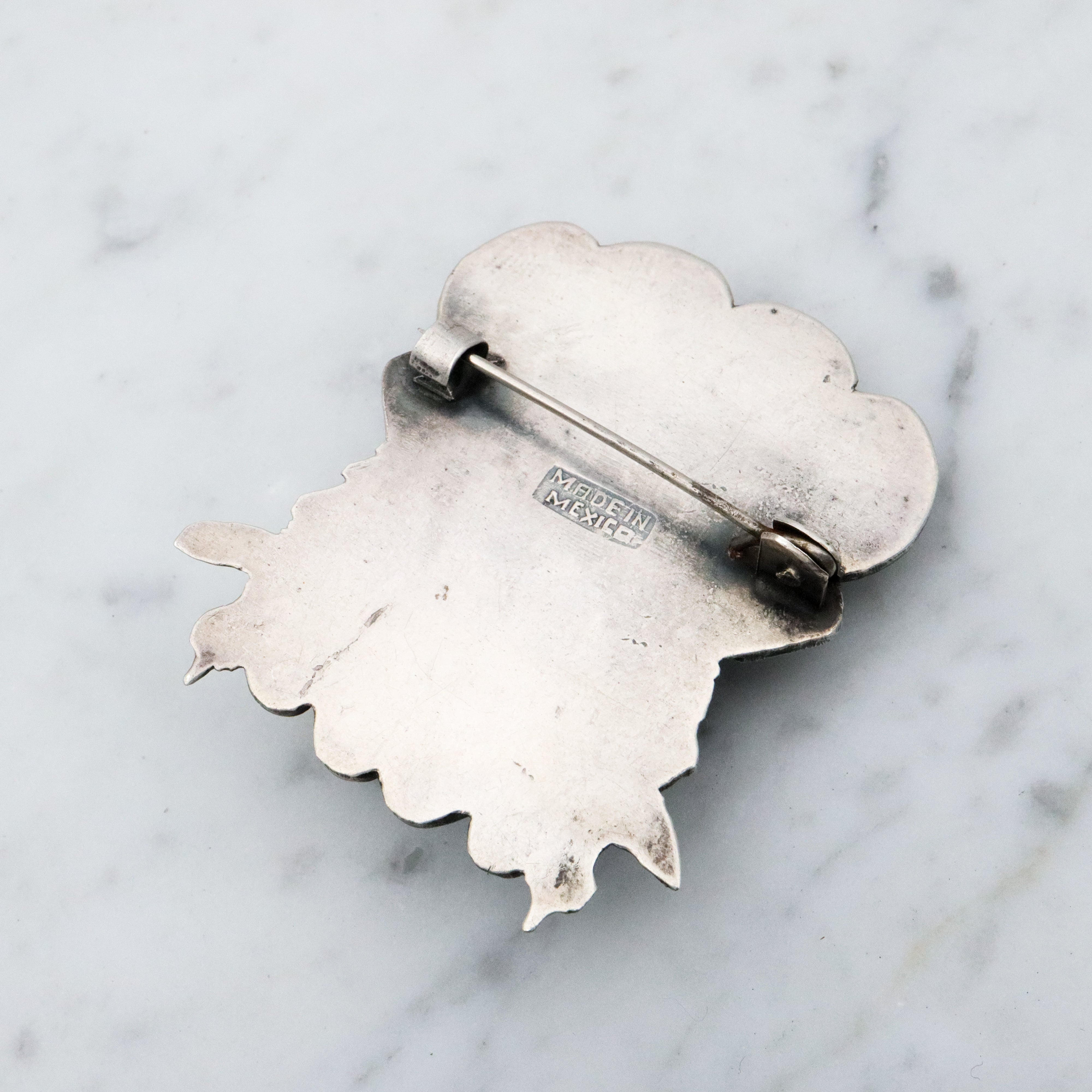 Antique 1920s Mexican sterling onyx carved Mayan mask brooch