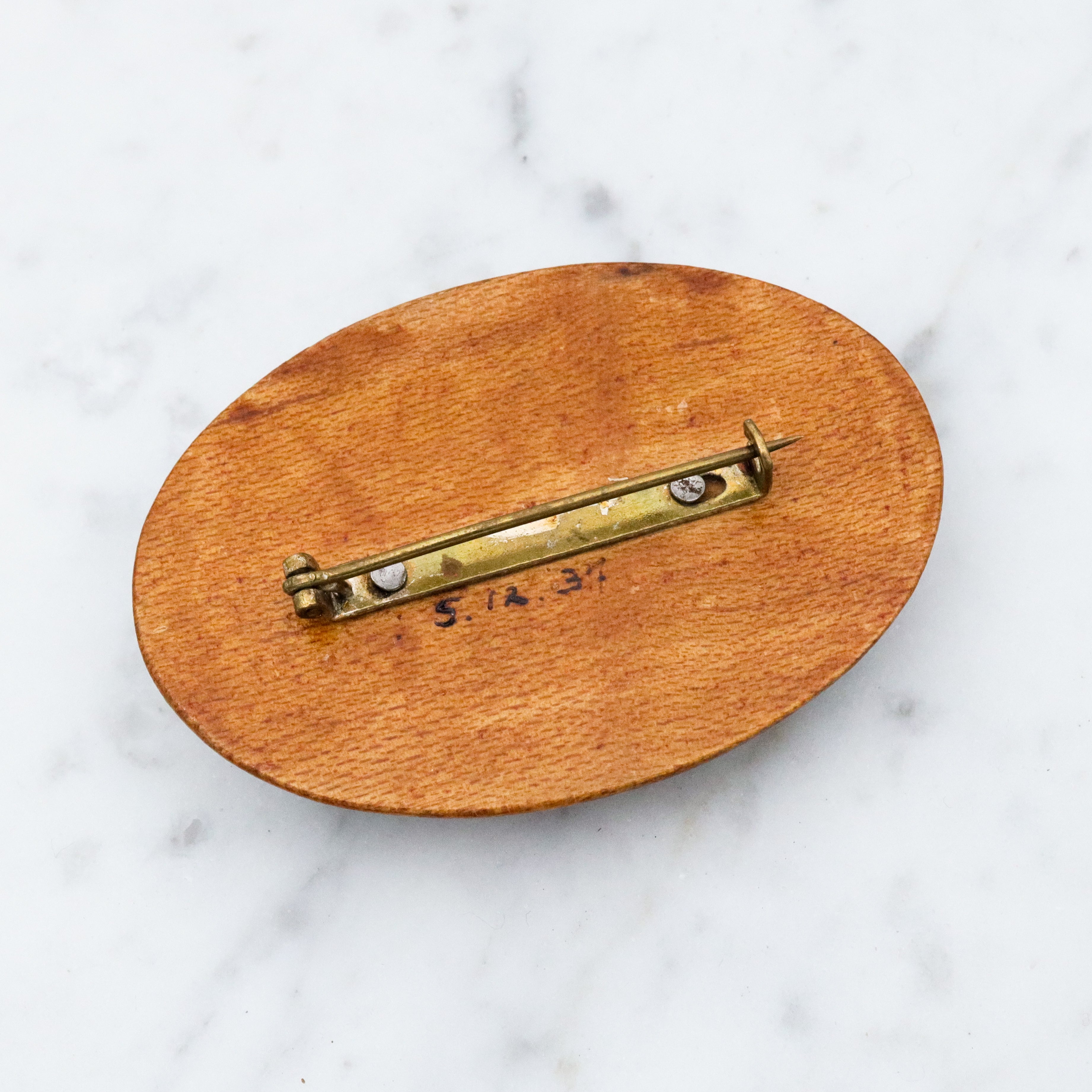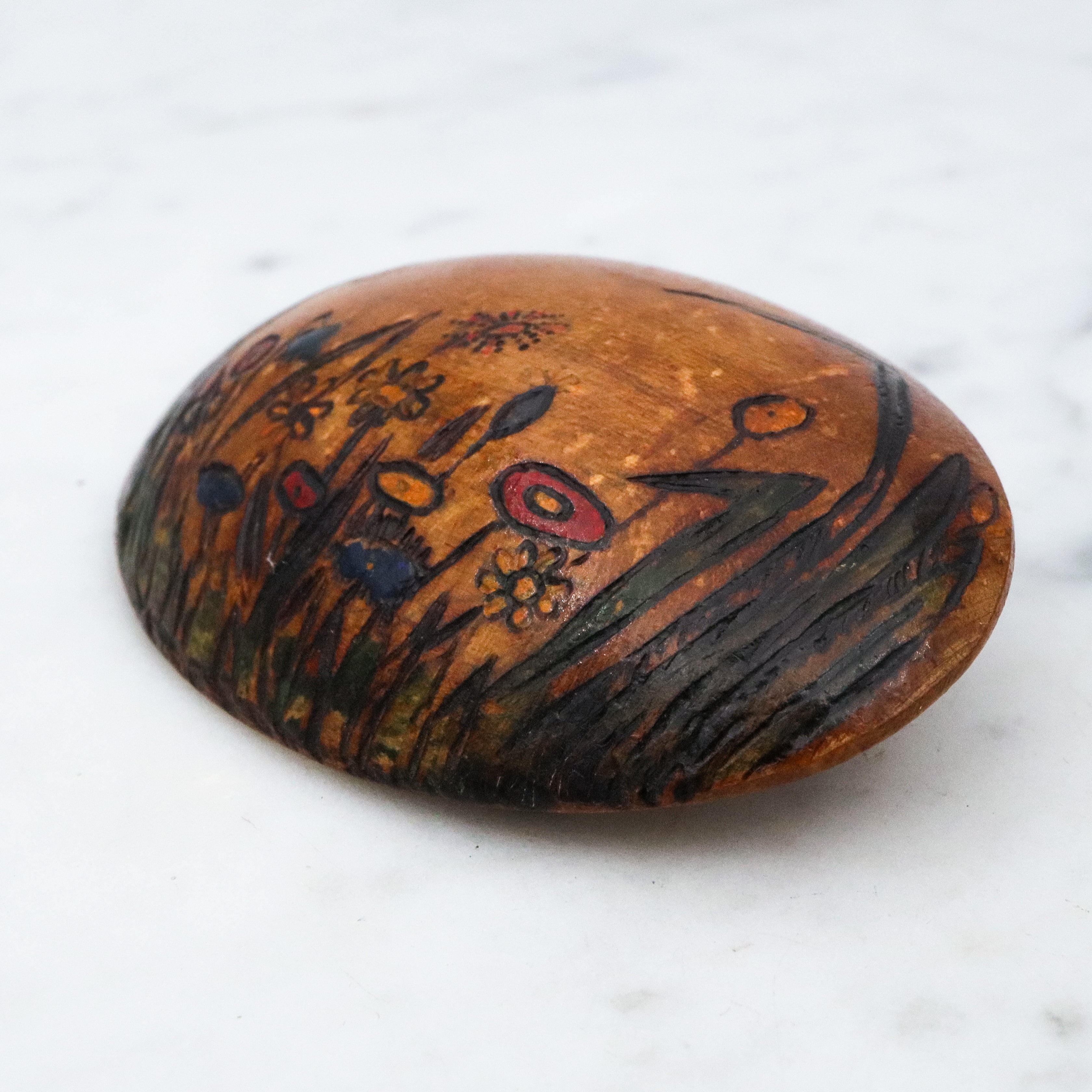 Antique 1937 handmade domed wooden brooch with painted floral scene