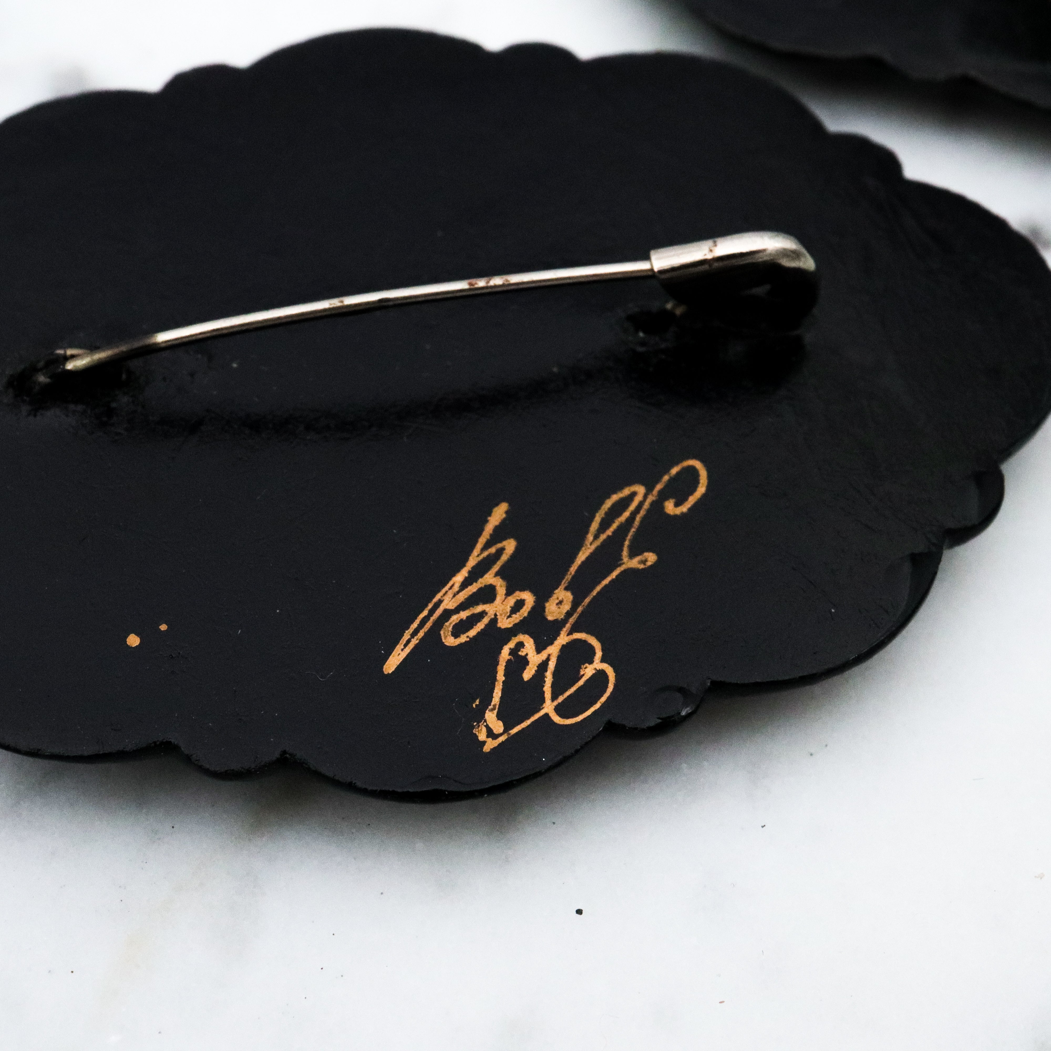 Vintage pair of hand painted floral Russian Zhostovo style brooches