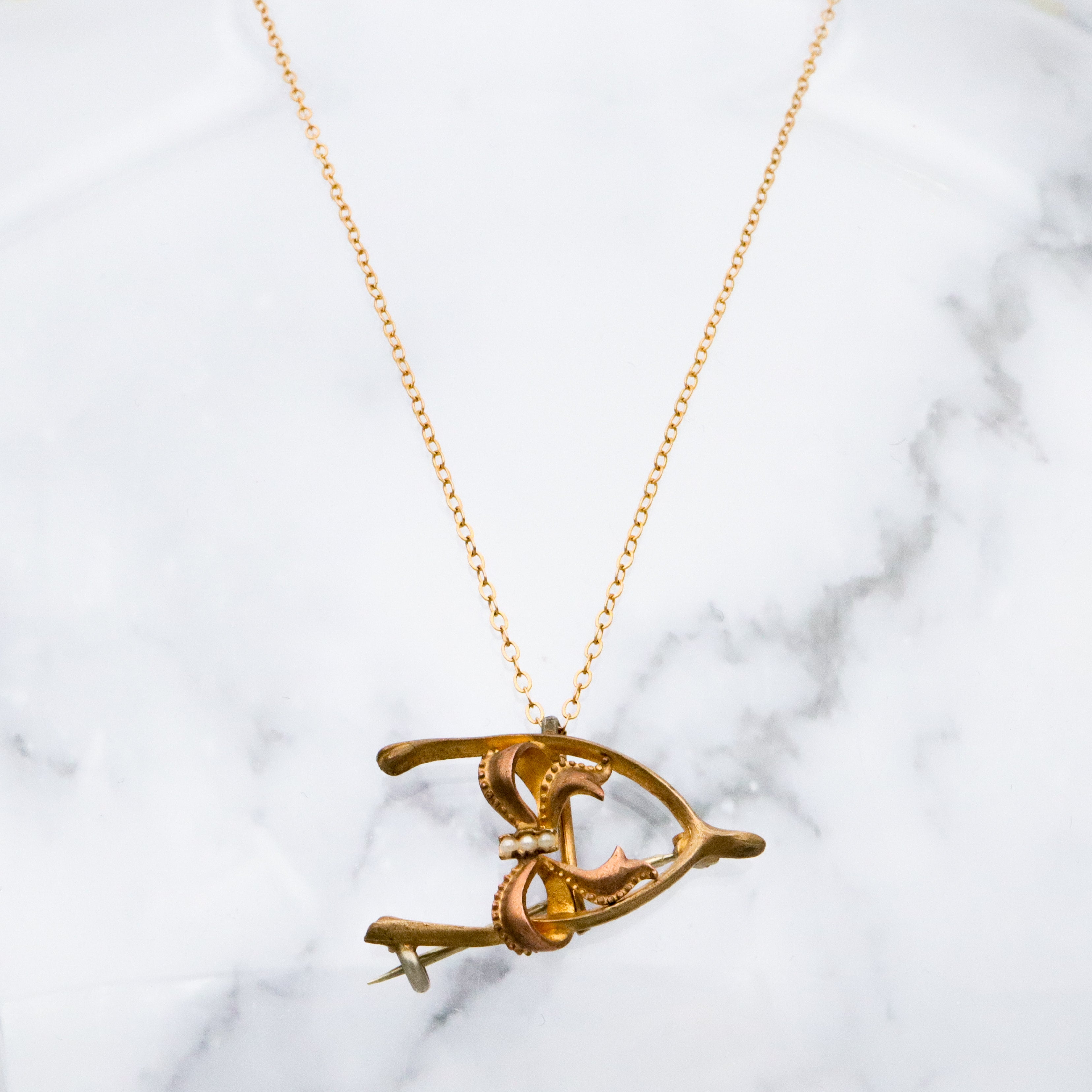 Antique Victorian gilt metal wishbone & bow watch clip brooch