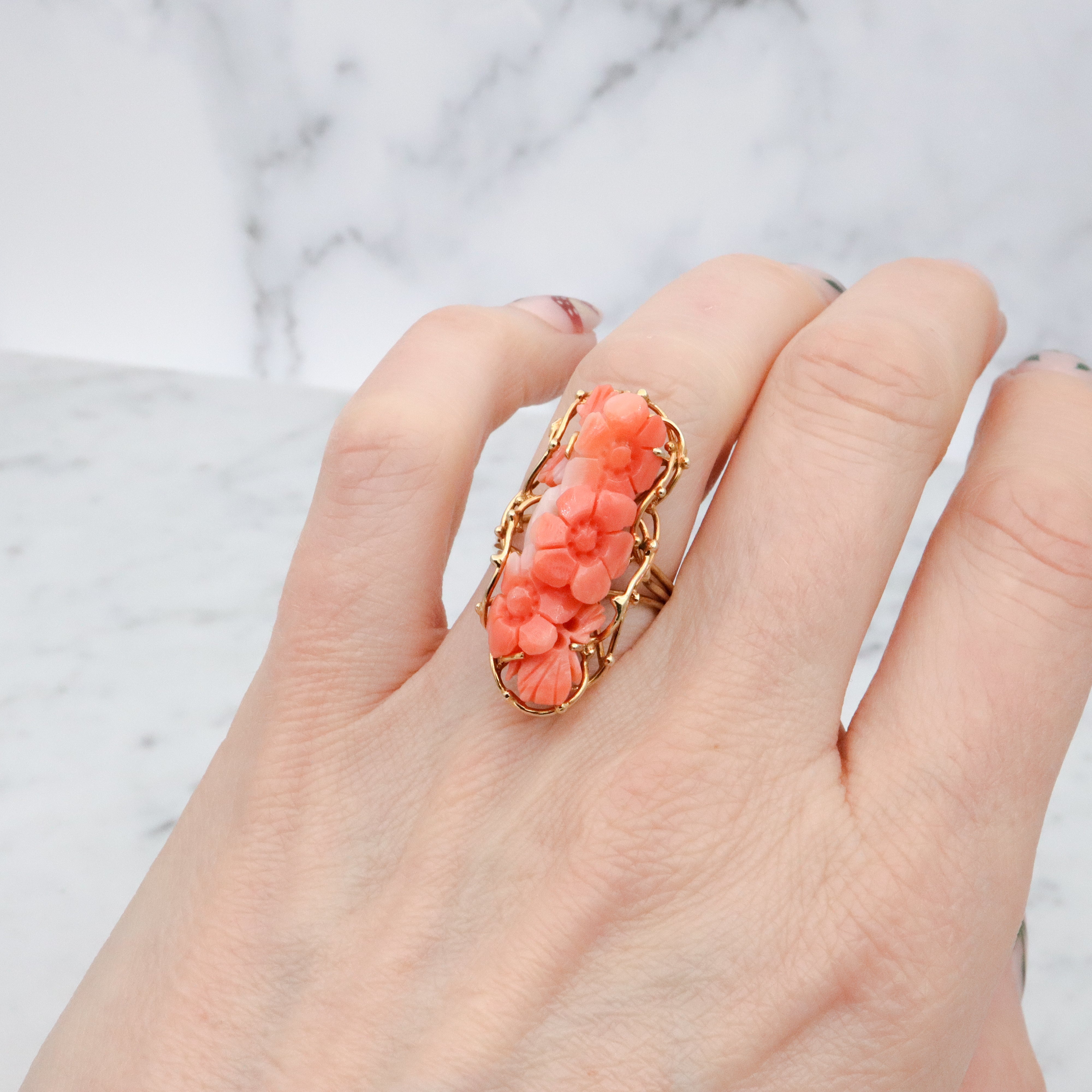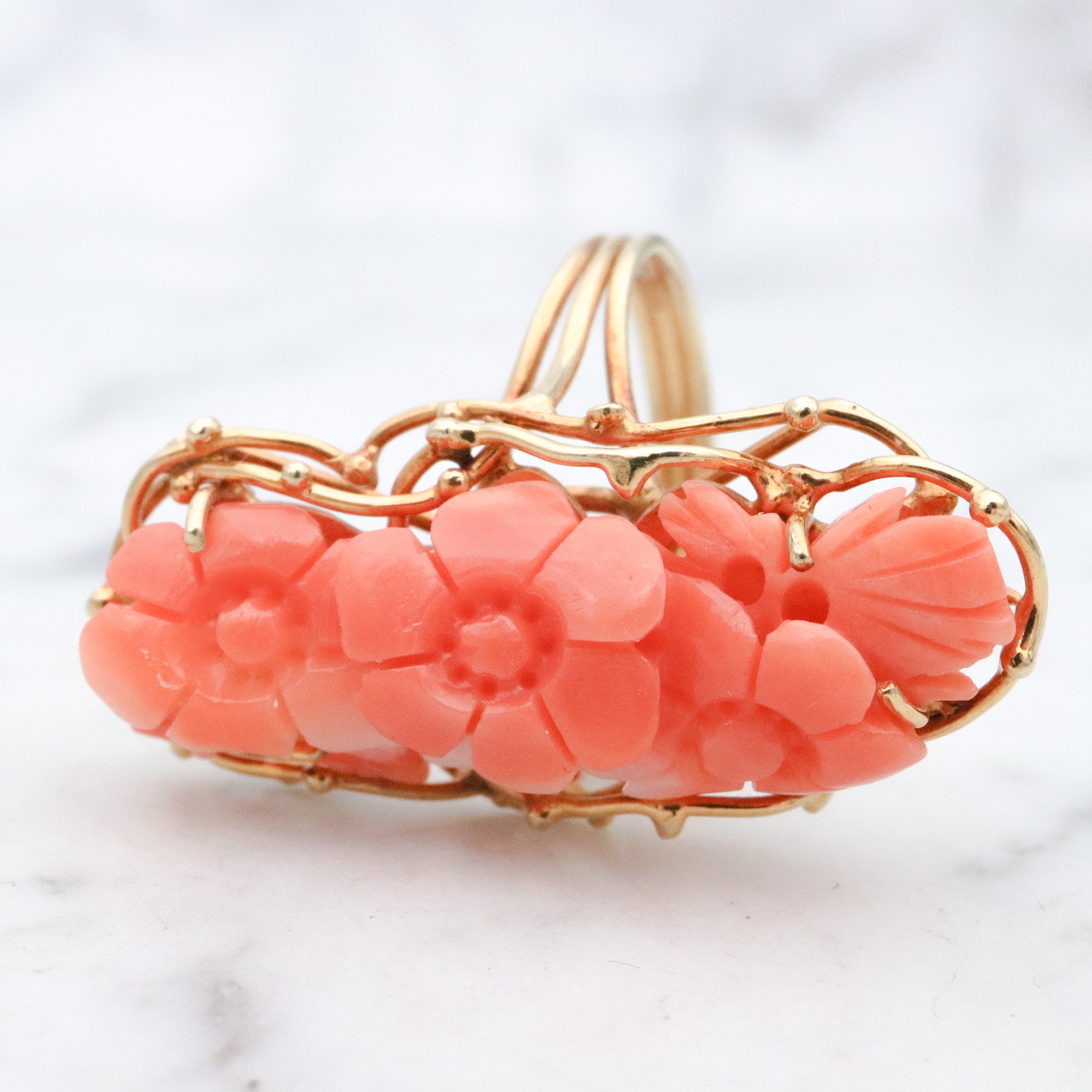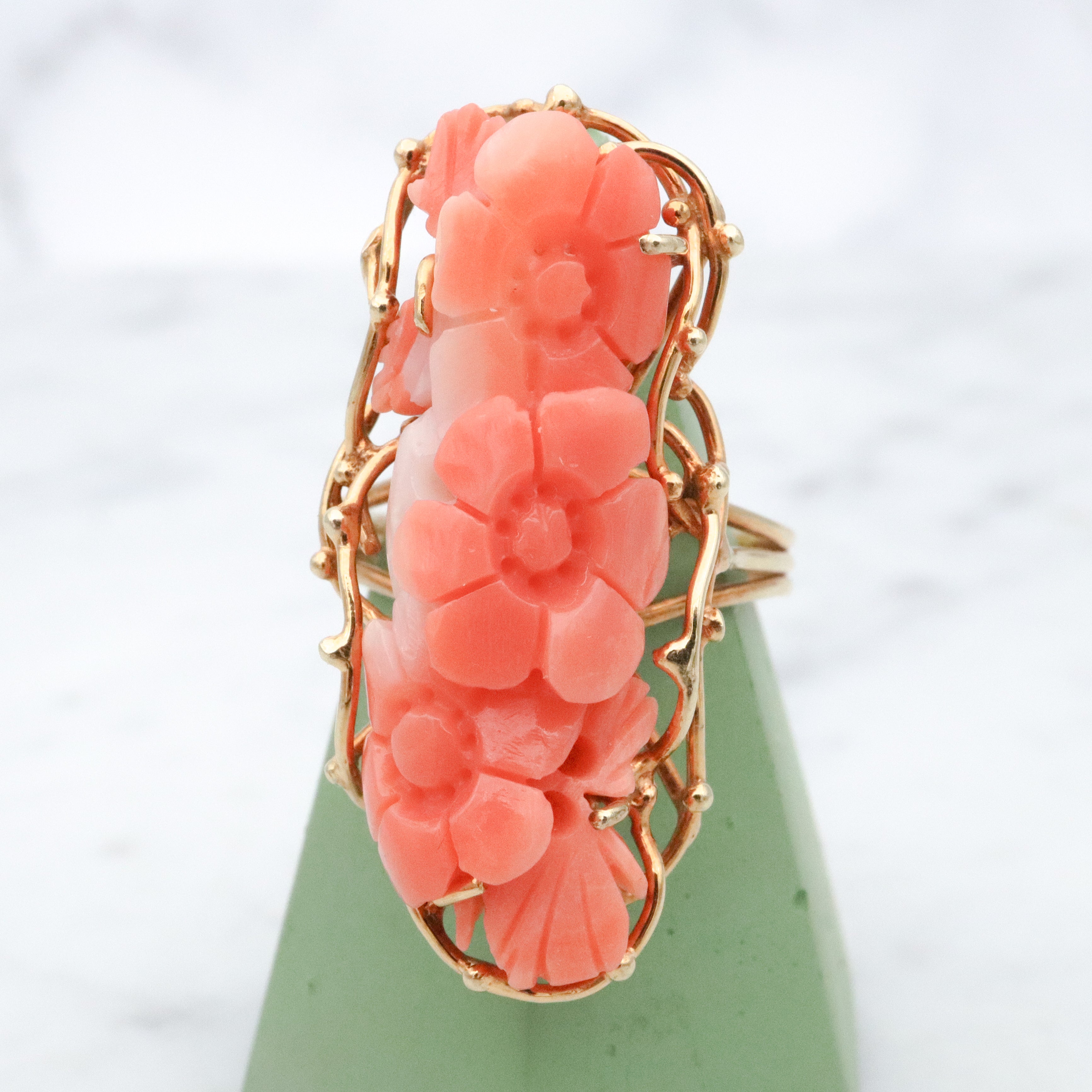 Vintage retro 14k gold floral carved coral navette ring, size 6.5