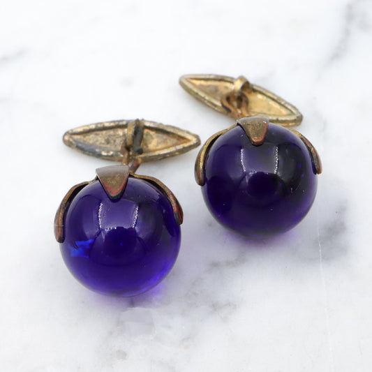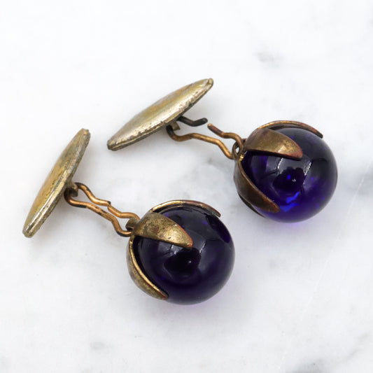 Antique cobalt blue glass sphere brass cuff links