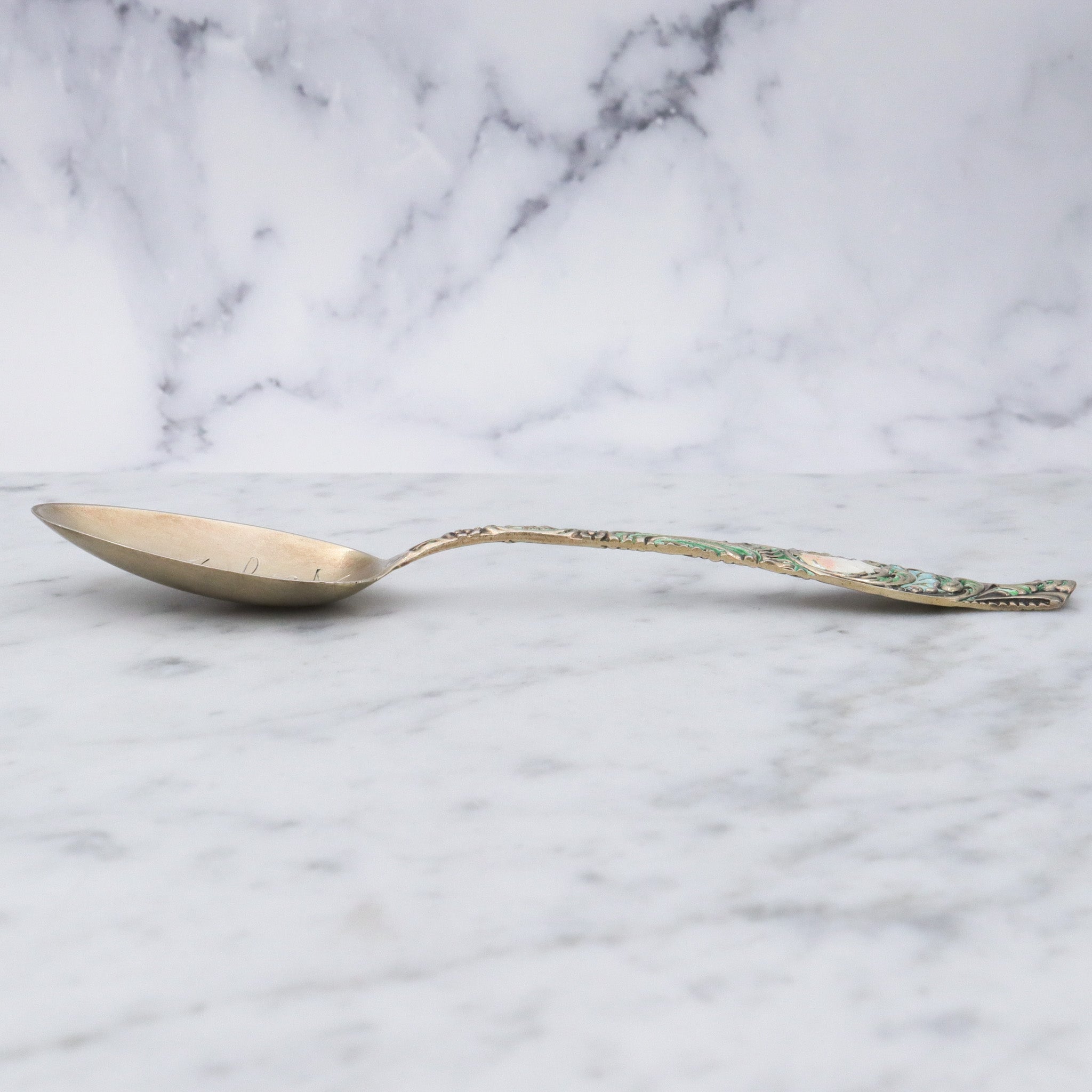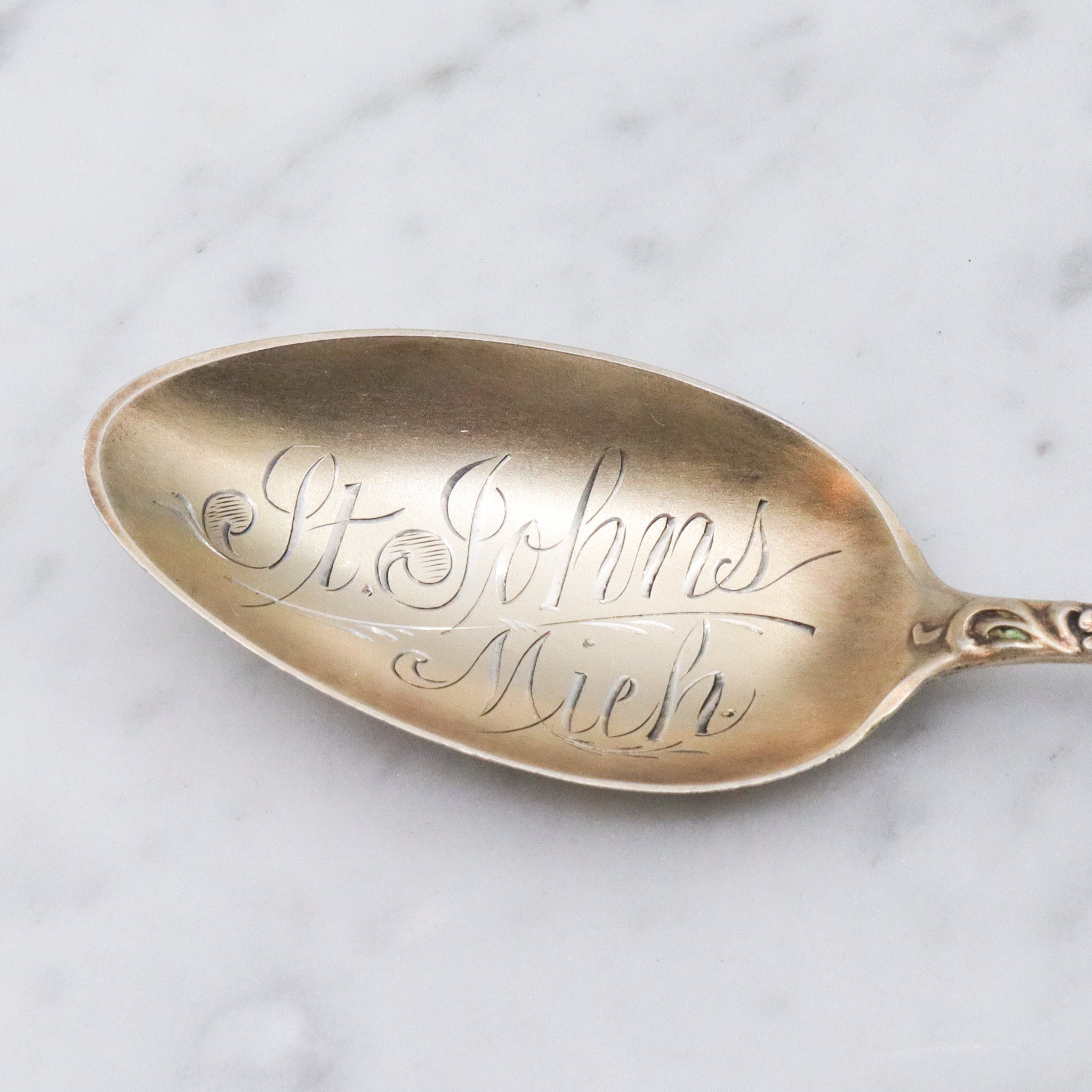 Antique Towle gilt sterling orleans pattern enamel souvenir spoon "St. Johns, Michigan"
