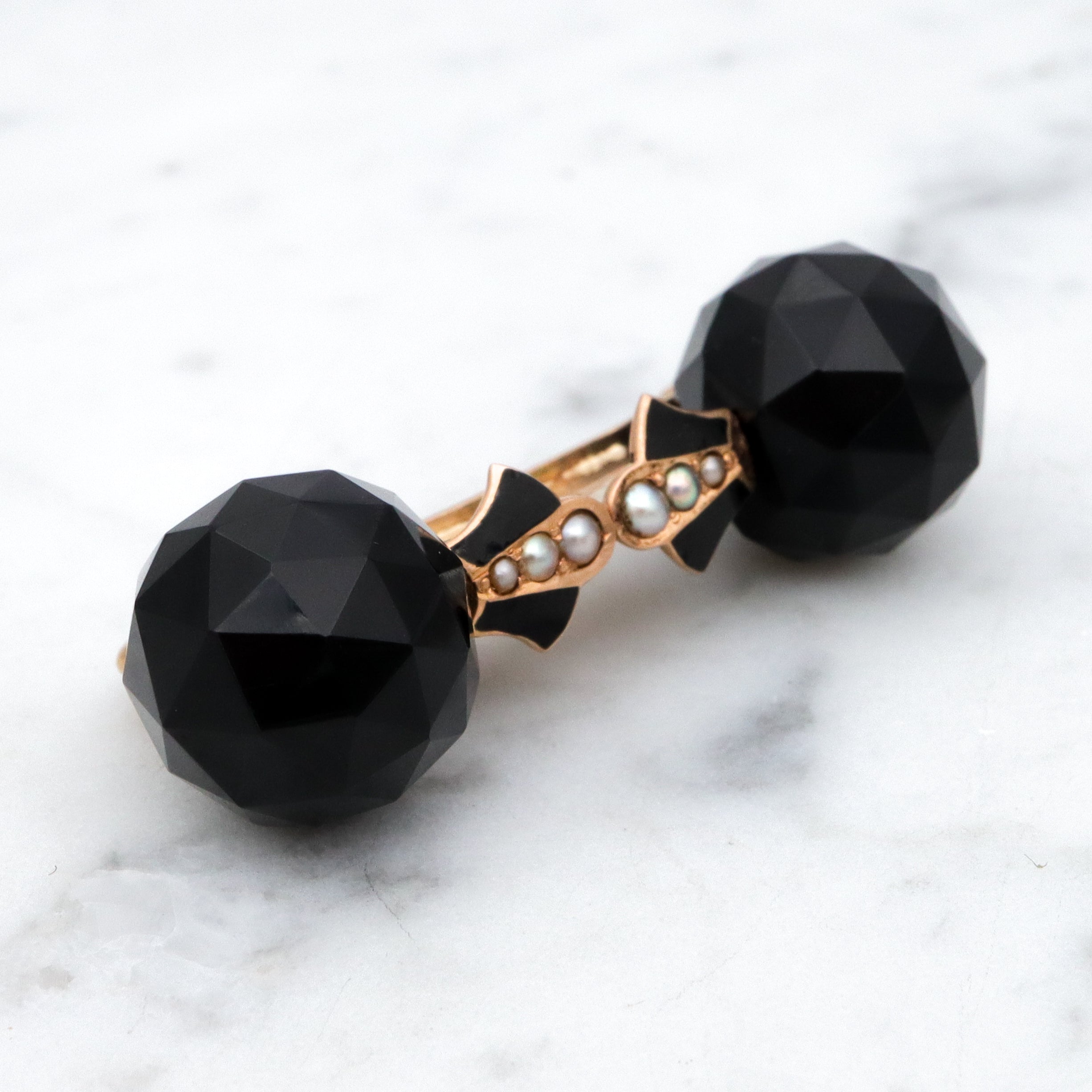 Antique Victorian 10k gold faceted jet glass, pearl, & enamel mourning brooch