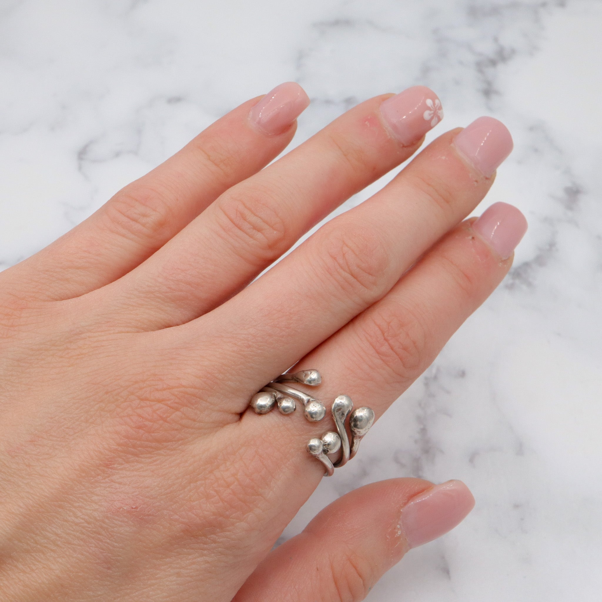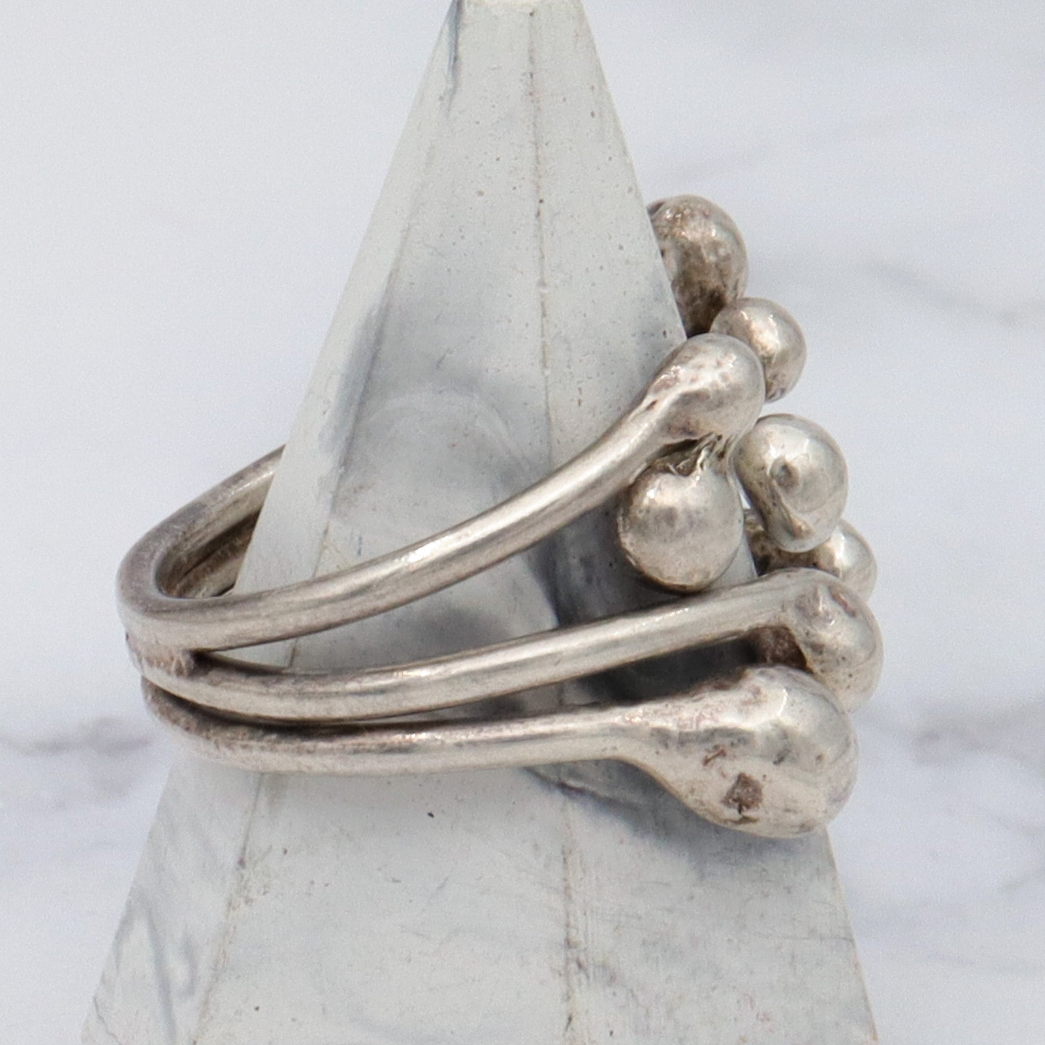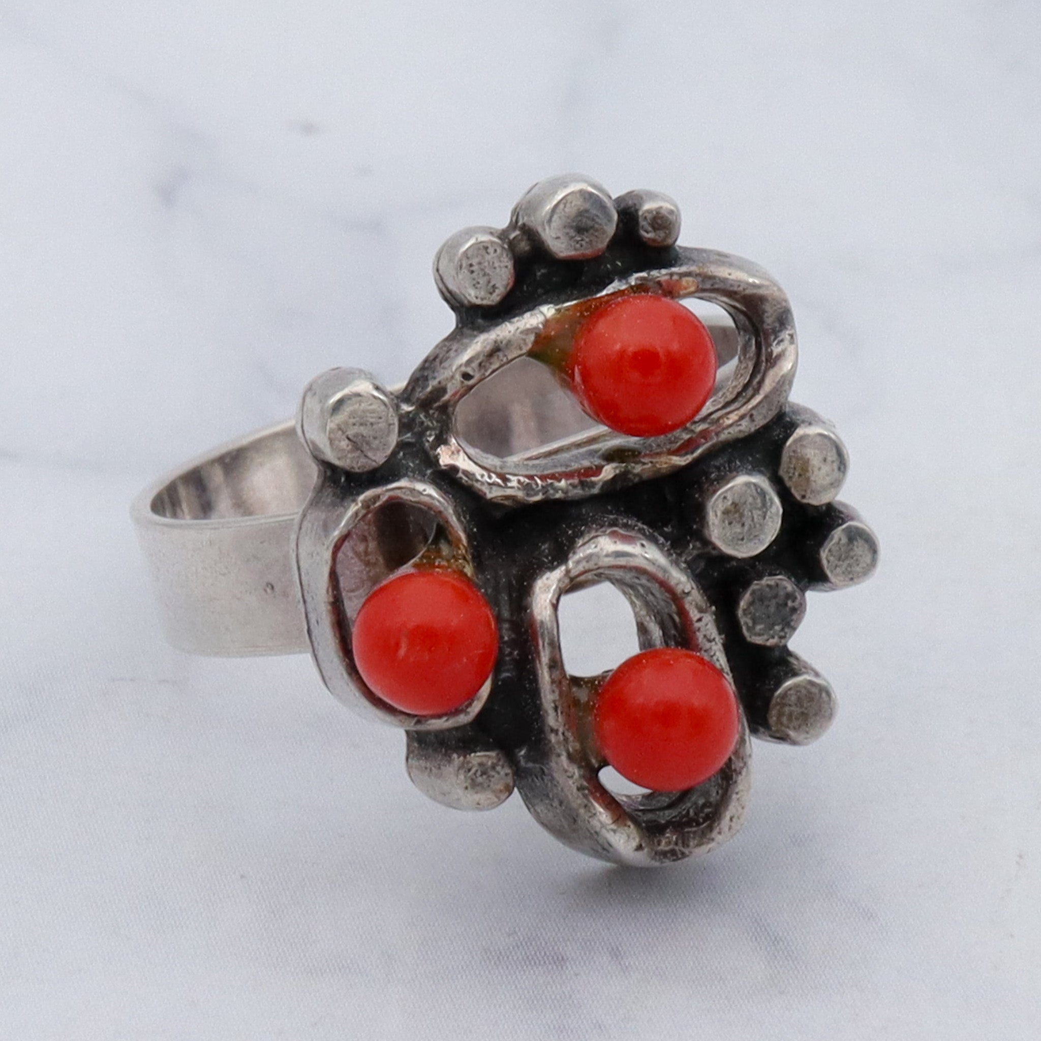 Vintage German modernist 835 silver coral beads signed adjustable ring, sz 8.5