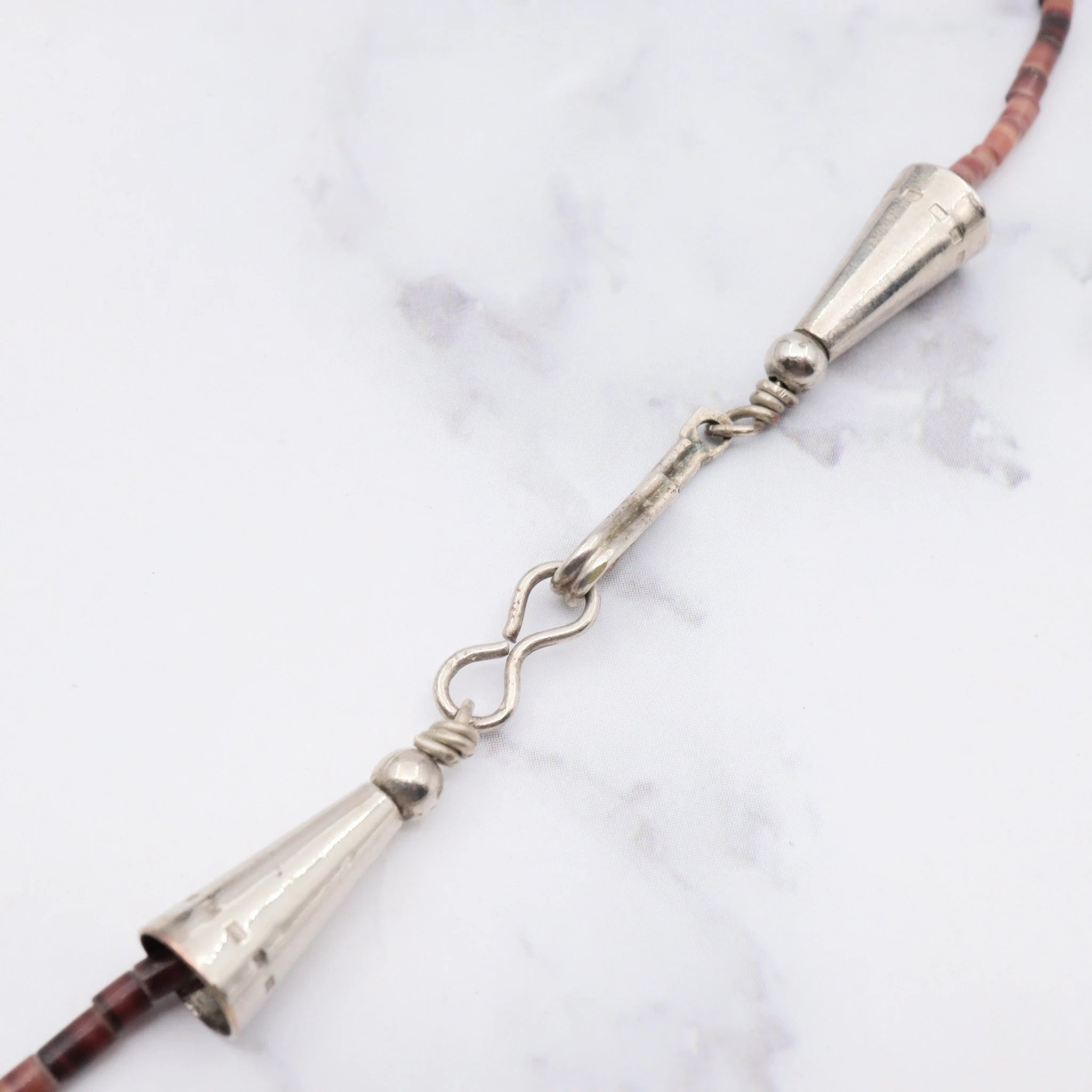 Native American carved rhodonite bear fetish necklace w/ heishi and turquoise beads, 32"