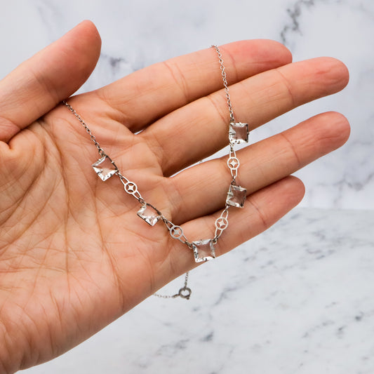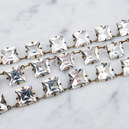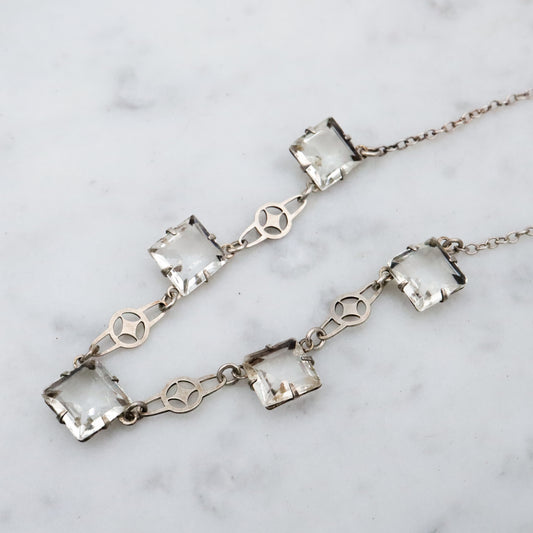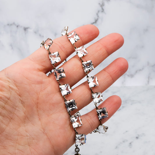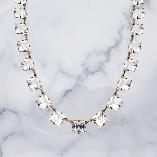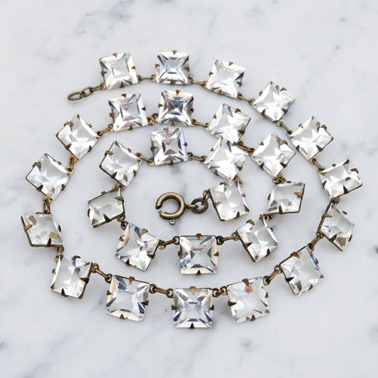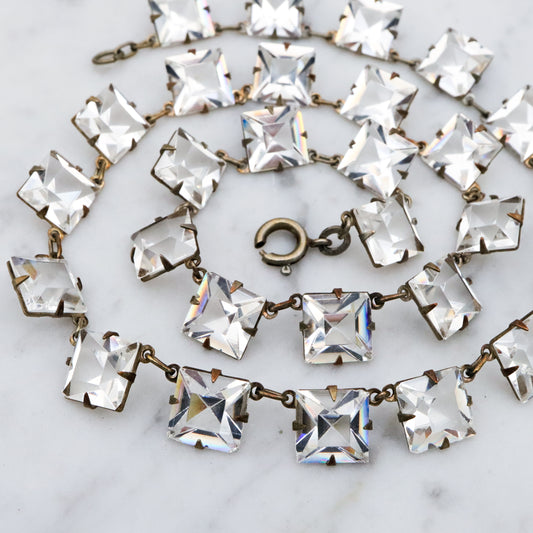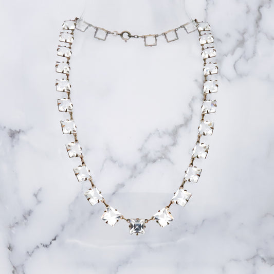 Antique Art Deco Platinon silver plated square open back crystal riviere necklace