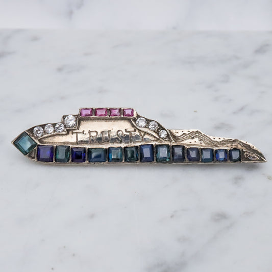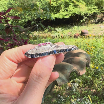 Antique Art Deco WWII "Trusty" sterling, ruby, sapphire, & quartz sweetheart ship brooch
