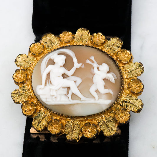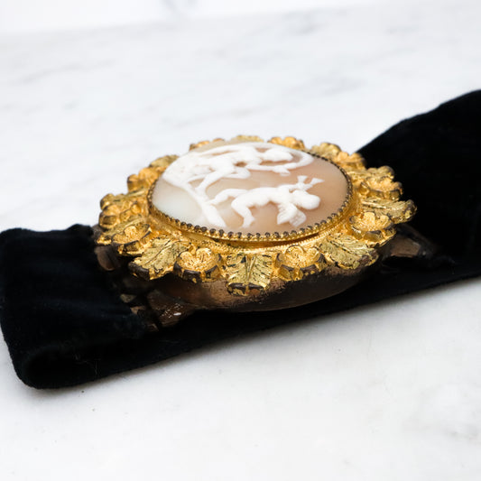 Antique Victorian Venus & Cupid gilt metal foliate framed cameo with velvet ribbon bracelet