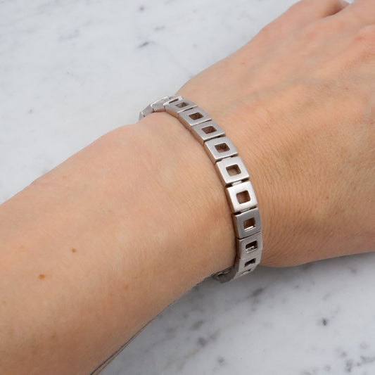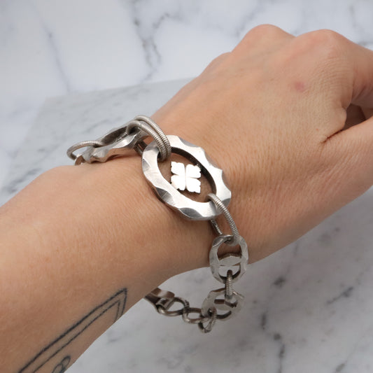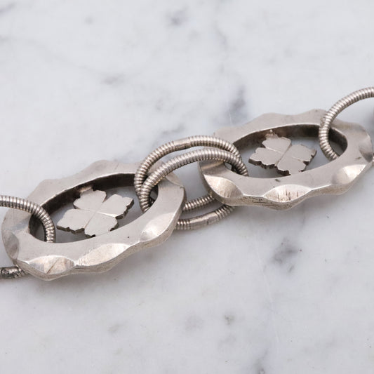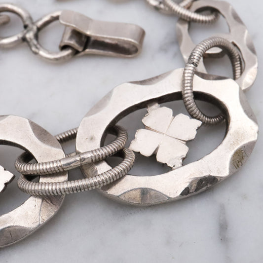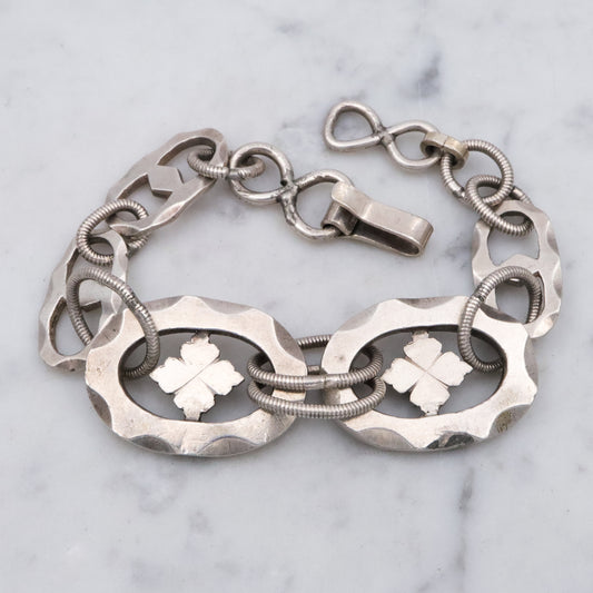 Mid Century hand wrought sterling hammered link clover motif bracelet