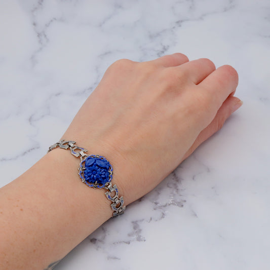 Antique Deco sterling molded blue lapis glass & enamel link bracelet