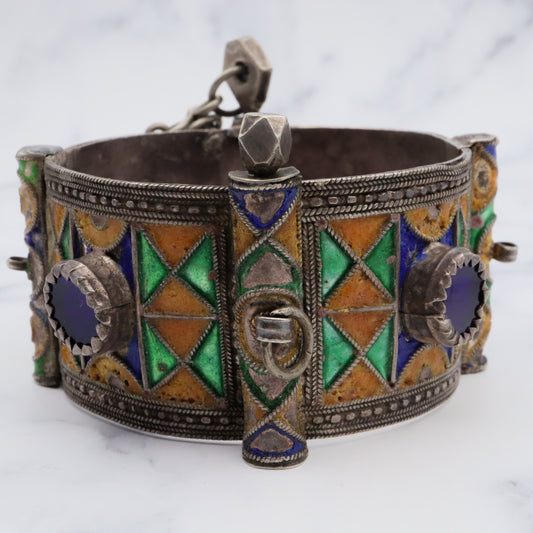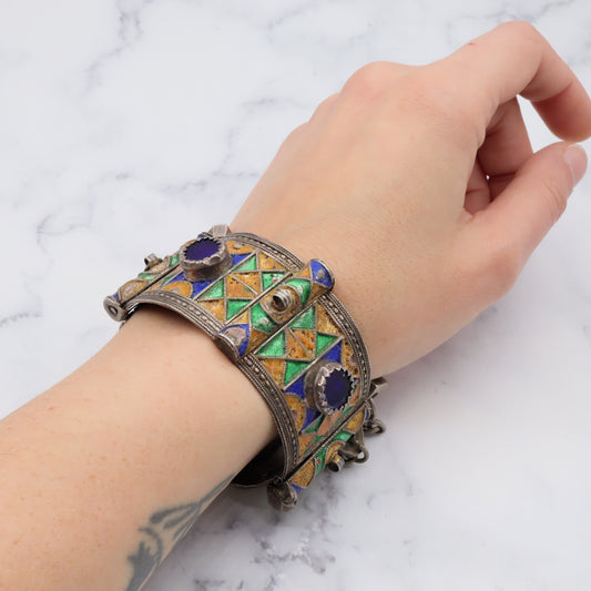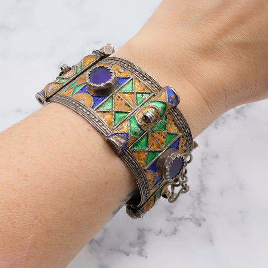 Antique Moroccan Berber sterling silver enamel and glass hinged cuff bracelet