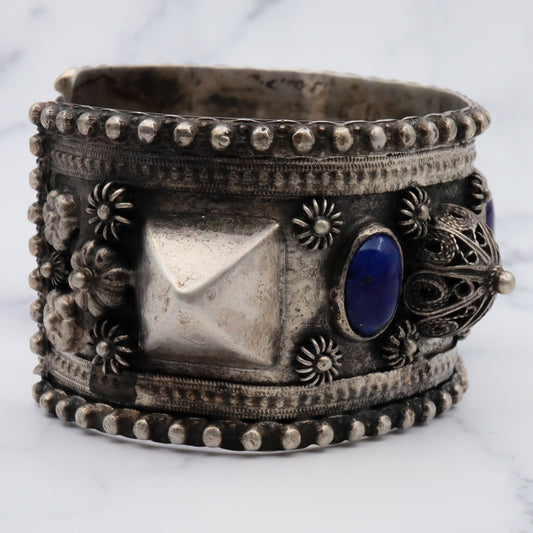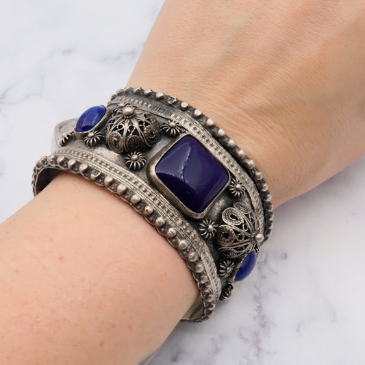 Antique Egyptian silver chunky tribal silver bangle with lapis art glass and cannetille filigree