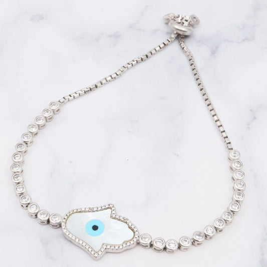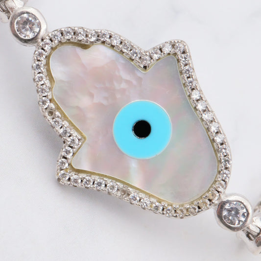 Vintage sterling, mother of pearl, hand of fatima and evil eye bracelet with cubic zirconia links