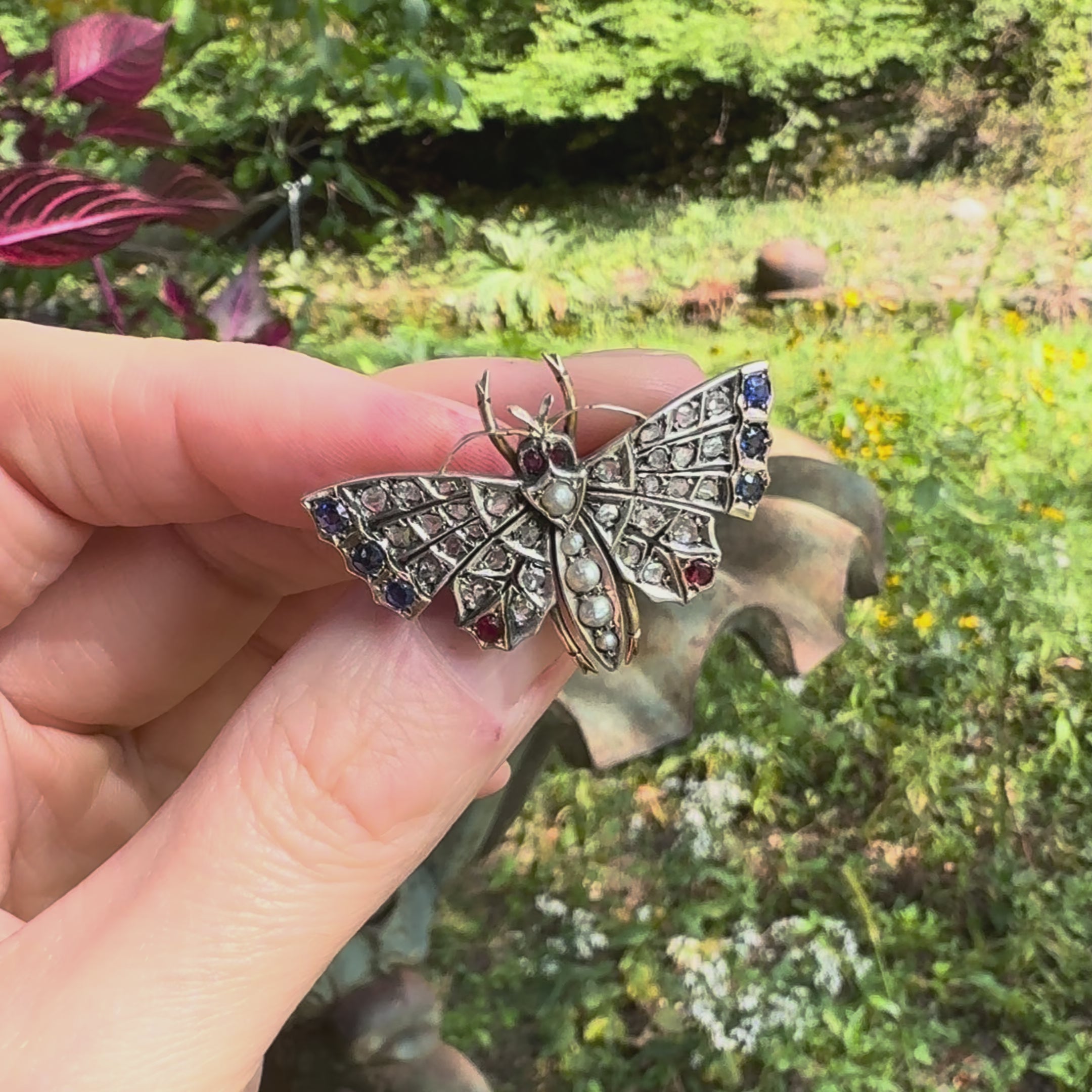 This truly exquisite antique piece was handmade in Victorian England & features a butterfly with wings encrusted with many hand cut rose cut diamonds, natural sapphires, & natural rubies, with a genuine split pearl body and ruby eyes; the gems are set in silver over gold with an open back to allow light to flow through. *this piece could be converted into a pendant; if you are interested, please message me