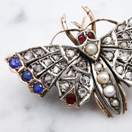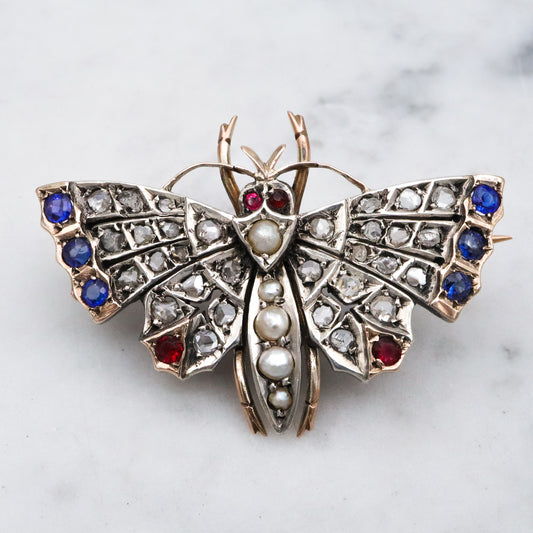 Antique Victorian rose cut diamond, ruby, & sapphire butterfly brooch