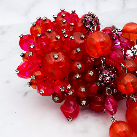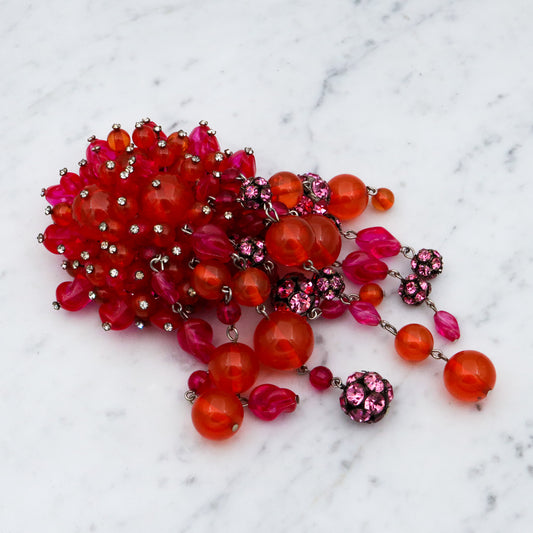 Rare Mid Century Brania huge orange & pink beaded brooch with long drops