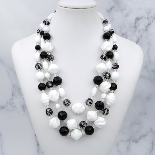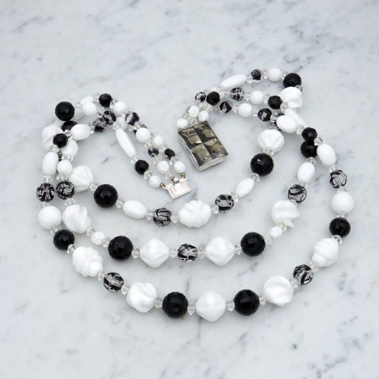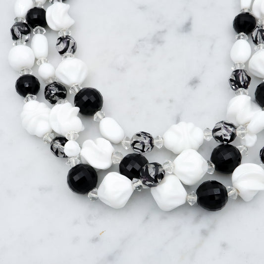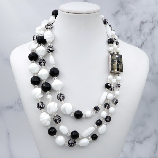 Retro Hattie Carnegie black, clear, & white milk glass beaded 3-strand necklace, 16.5"