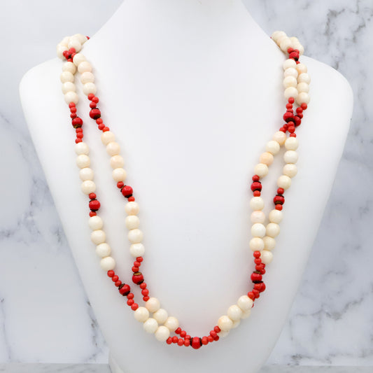 70s Miriam Haskell faux coral & pearl double strand necklace with slide clasp, 26"