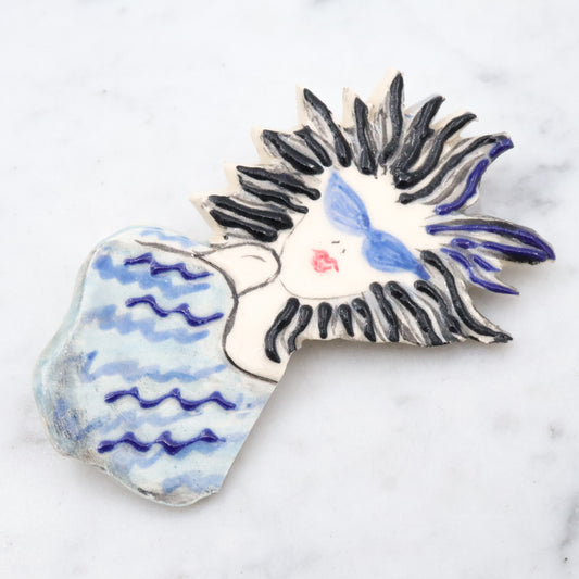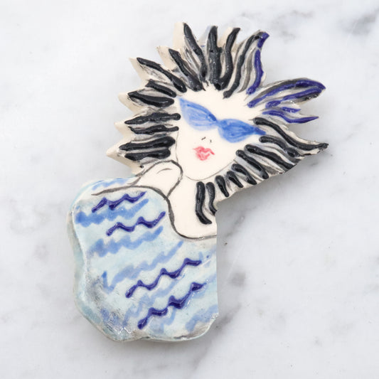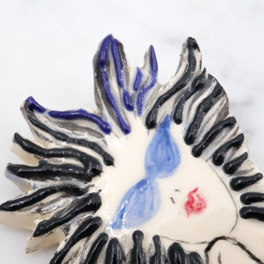 Retro handmade painted ceramic blue & white lady brooch