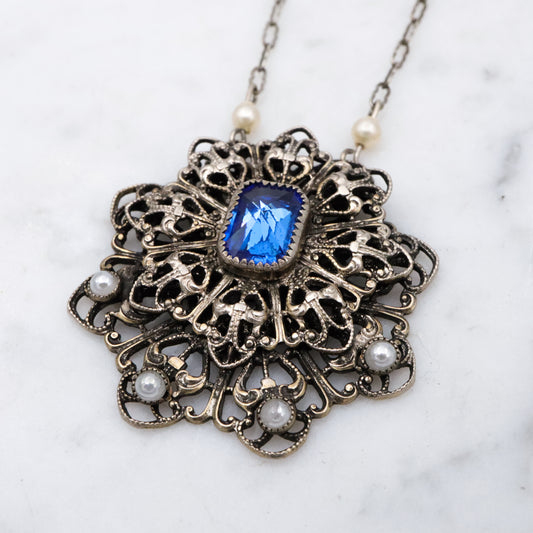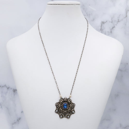 1950s silver tone filigree sapphire crystal & faux pearl flower pendant necklace