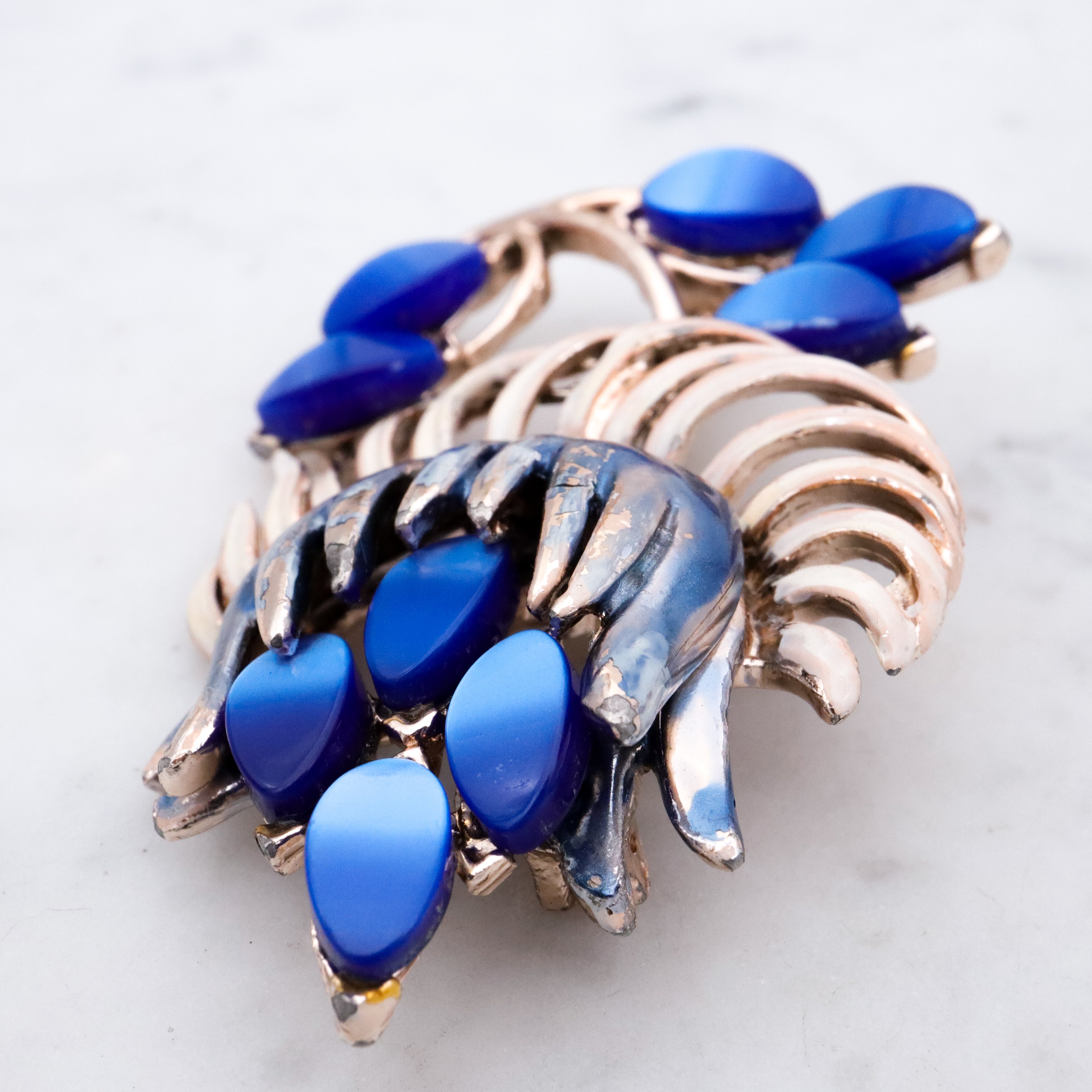 This sweet vintage brooch features a figural protea or chrysanthemum style flower with white & blue painted silver tone metal and oval carved shimmering blue thermoset accents.