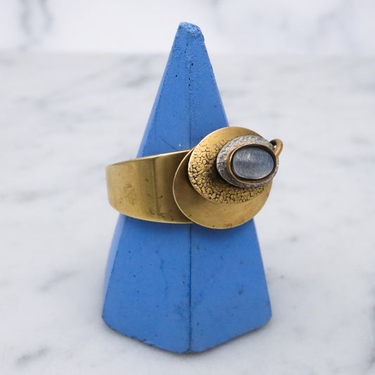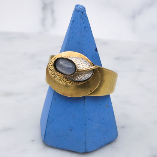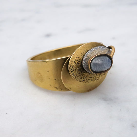 MCM studio artist geometric brass ring w/moonstone, size 10