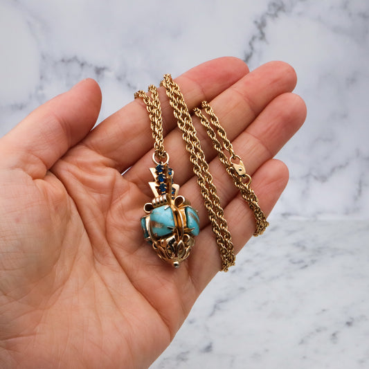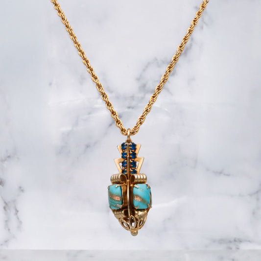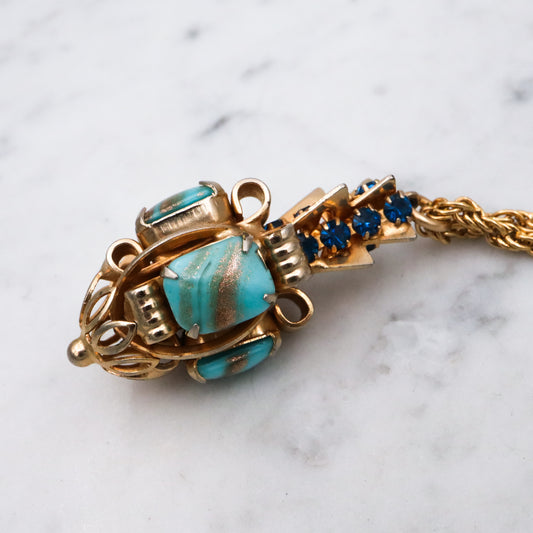 Mid Century turquoise art glass & sapphire rhinestone geometric drop pendant necklace