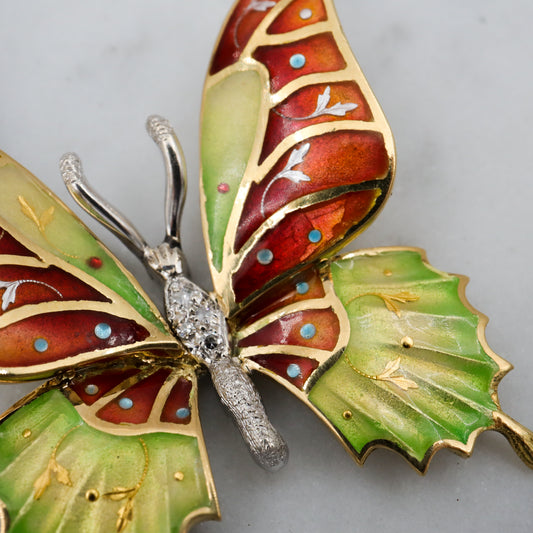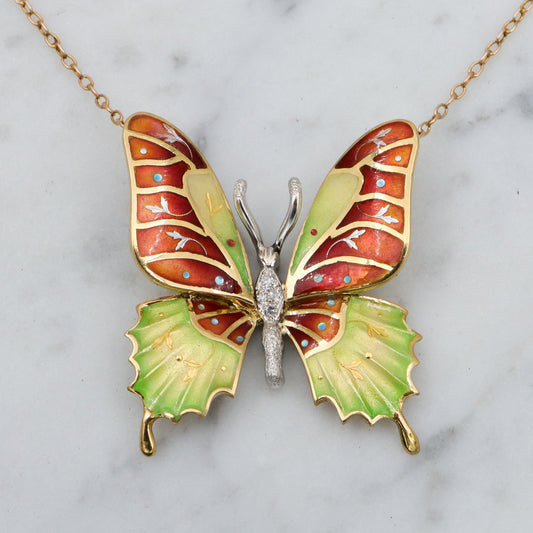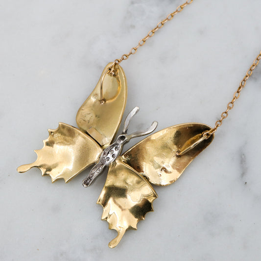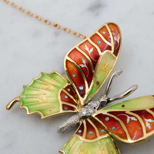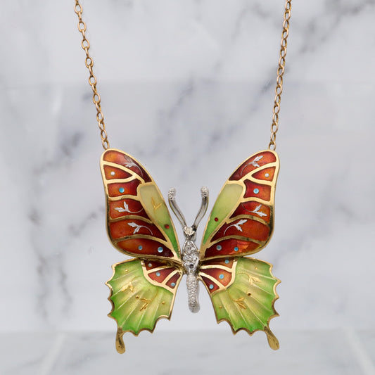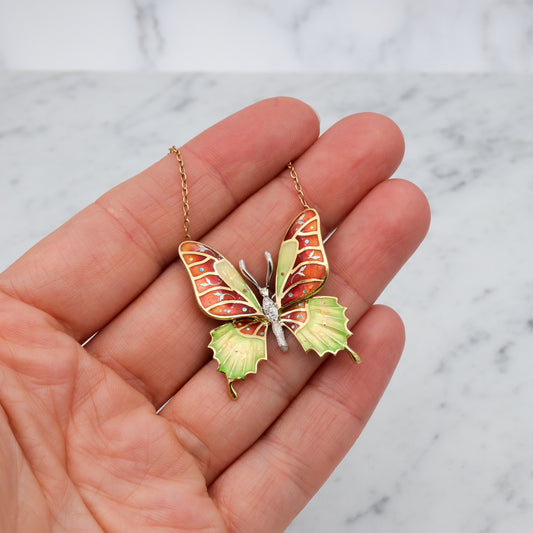 Antique 14k gold enamel & diamond butterfly pendant necklace
