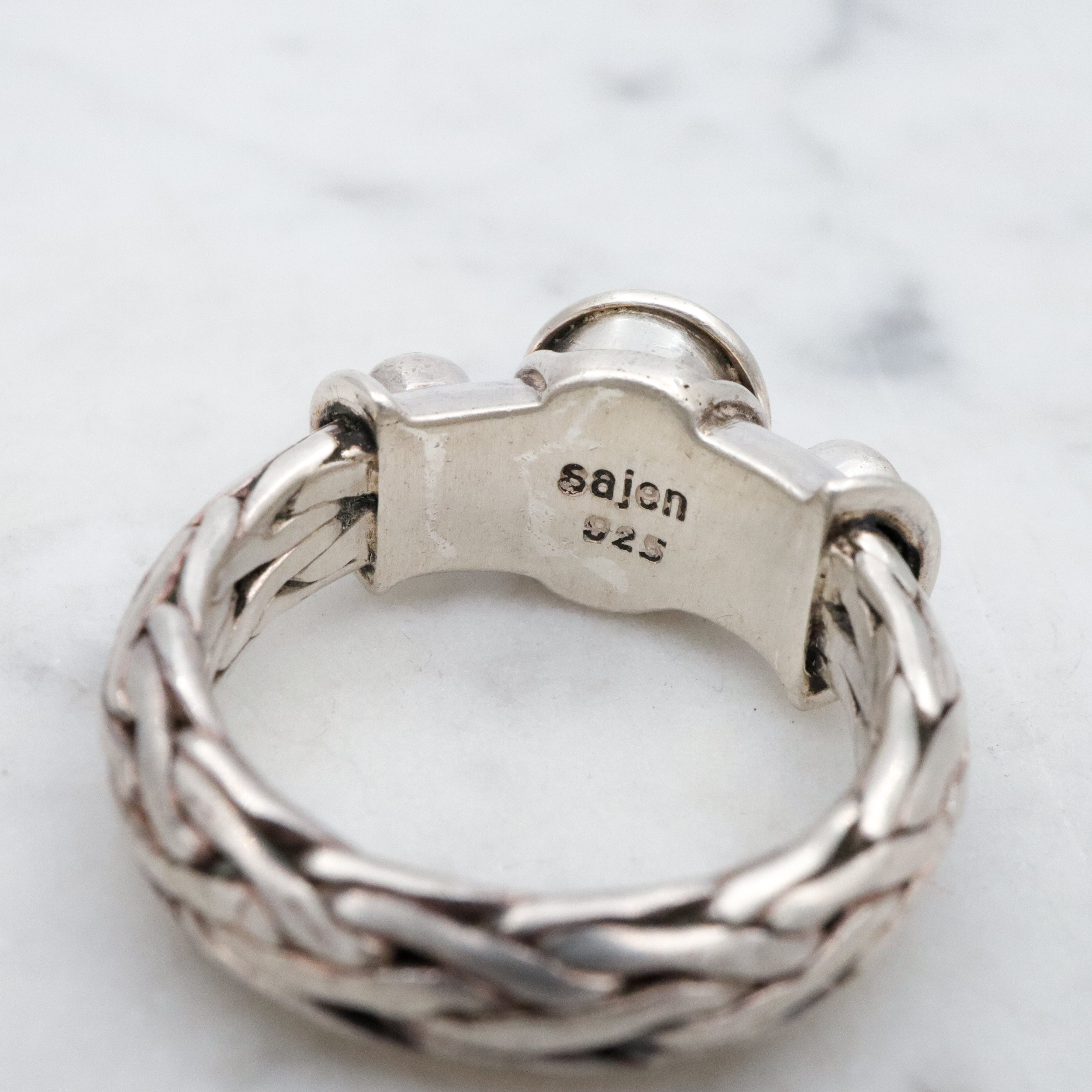This classic design by Balinese designer Sajen, which has been retired, features a central amethyst cabochon bordered by two small peridot cabochons, set in a heavy geometric style head and a thick band of woven sterling "rope".