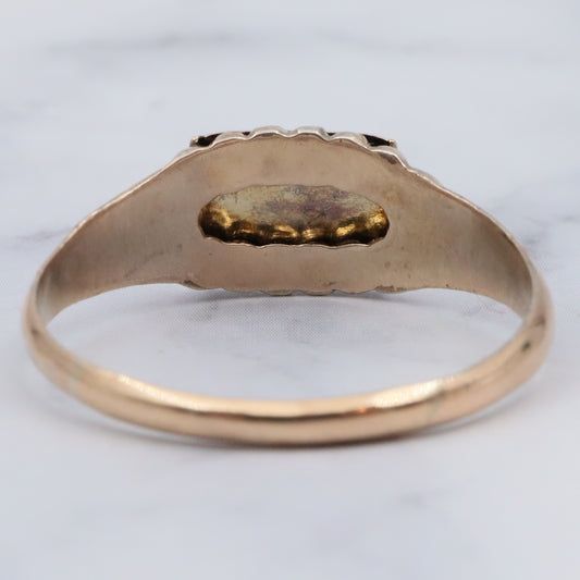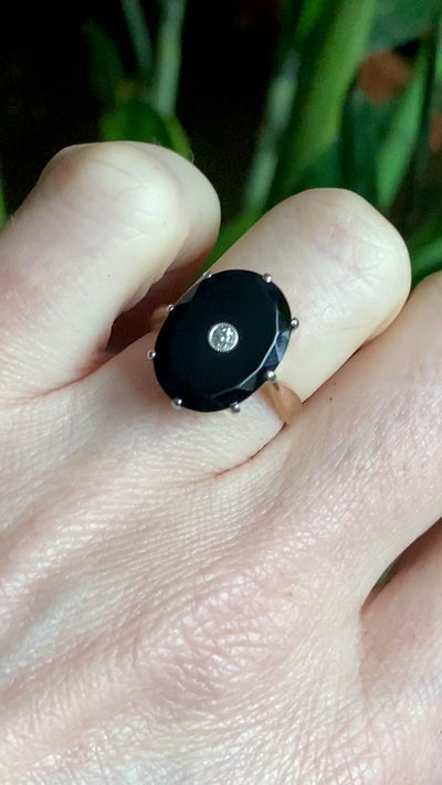 Antique Victorian 18k gold faceted onyx with old European cut diamond center with platinum tip ring, sz 6