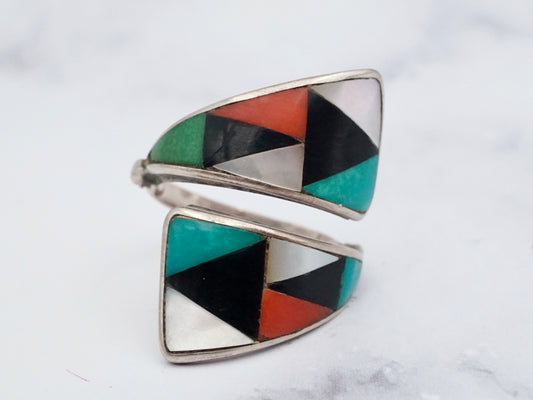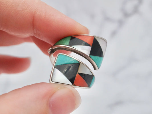 Vintage Zuni stone inlay sterling wrap ring, size 8