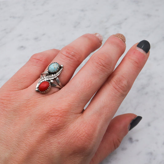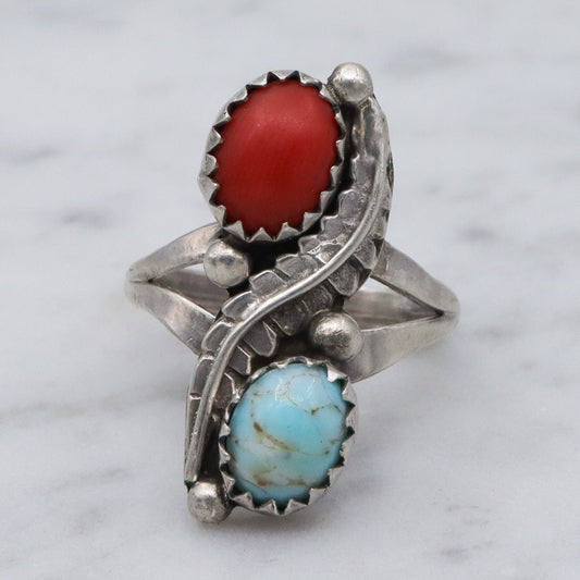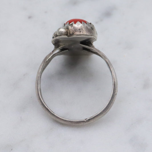 Vintage Native American sterling silver coral and art glass navette ring, sz 5.75