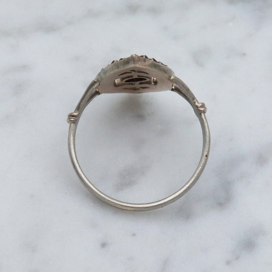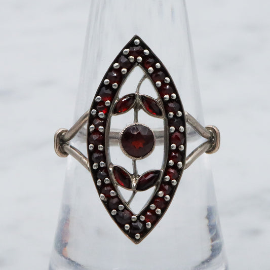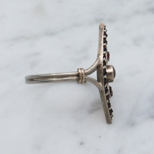 Antique sterling silver Bohemian rose cut garnet navette ring, sz 7.75