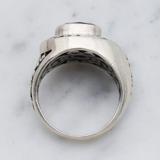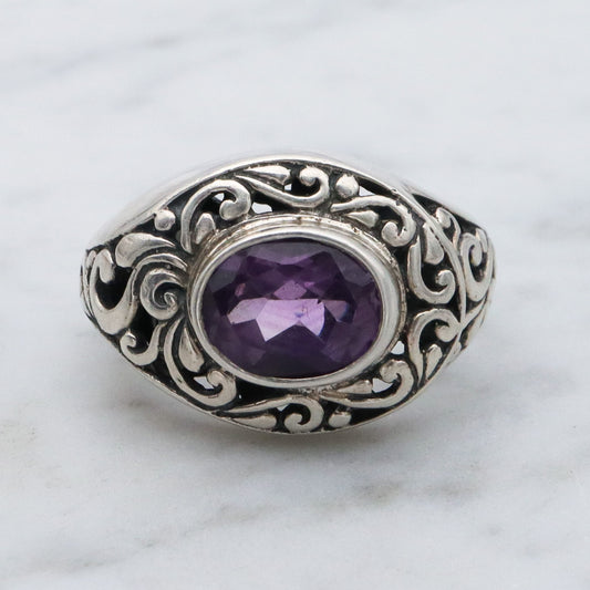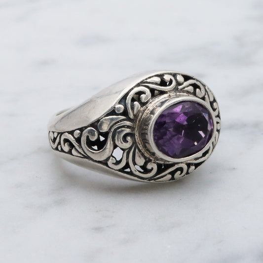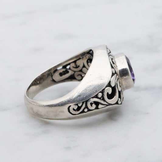 Vintage sterling silver amethyst scroll cut out ring, sz 6