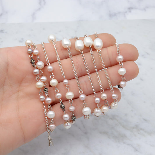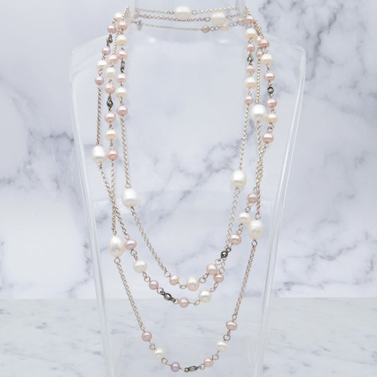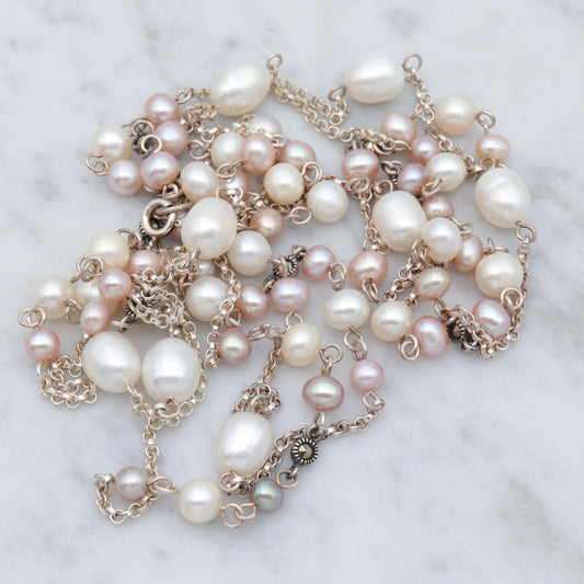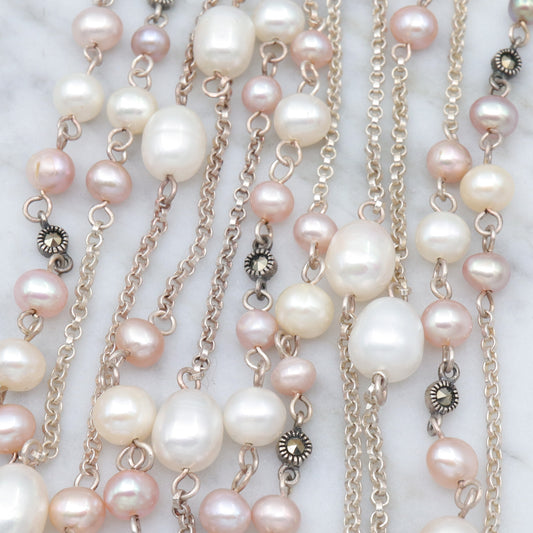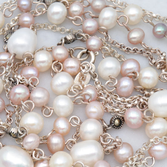 Vintage opera length pearl & marcasite sterling necklace, 54”