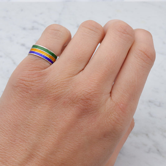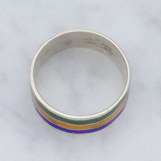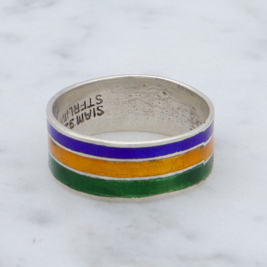 Vintage Siam sterling, green, yellow & blue enamel band, sz 5