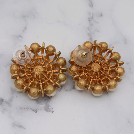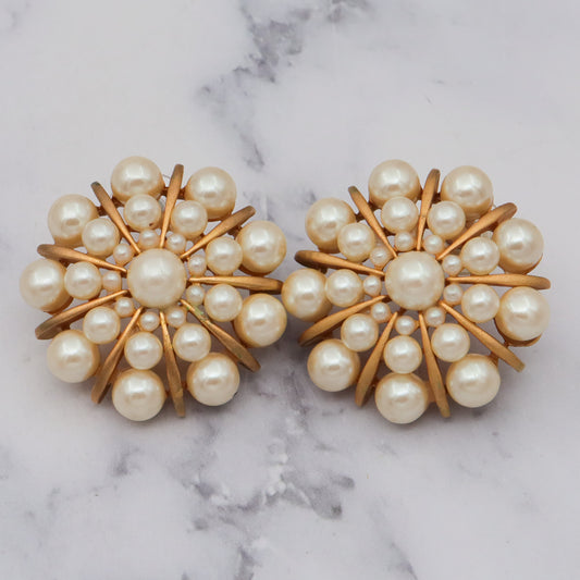 Large Vintage faux pearl starburst cluster gold plated post earrings
