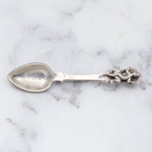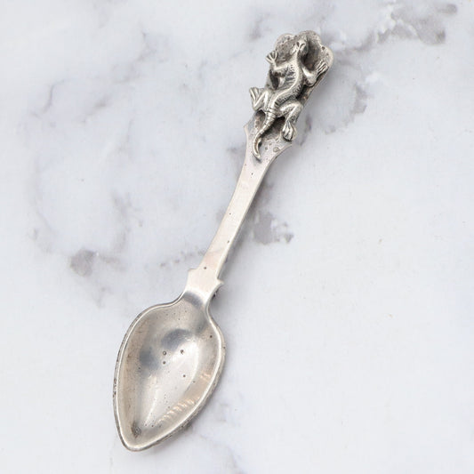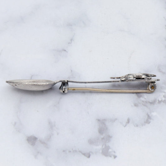 Antique sterling salt spoon brooch with figural lizard