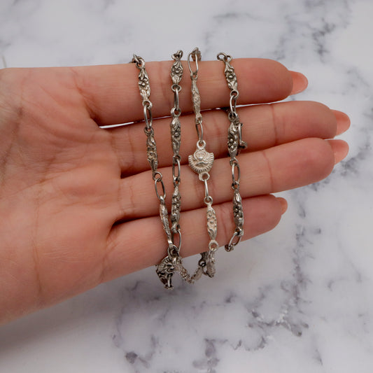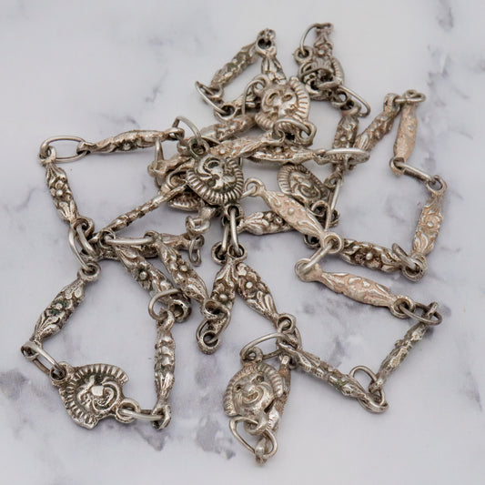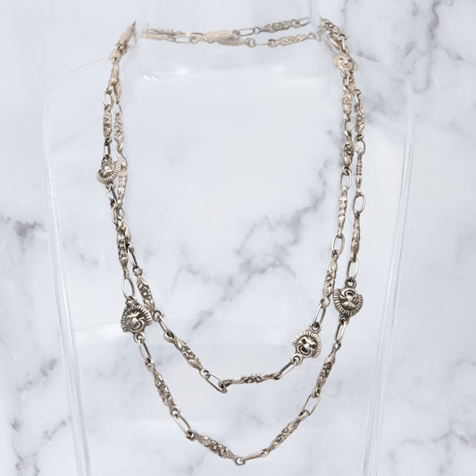 Vintage sterling Mexican Mayan mask link, long chain necklace 32”