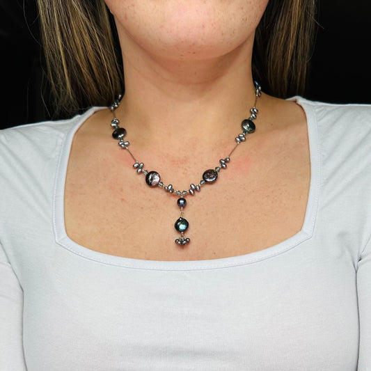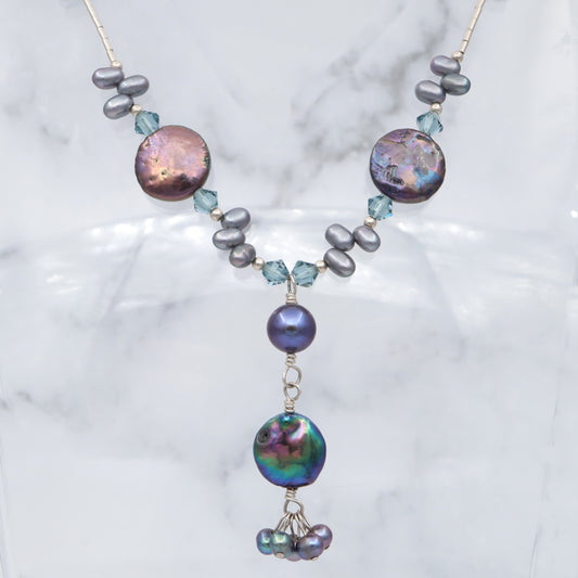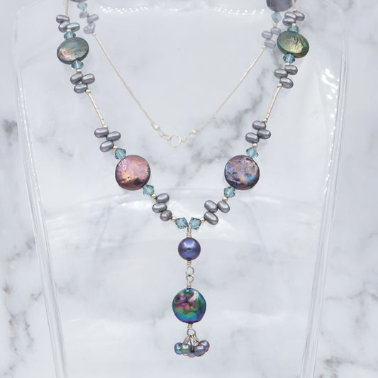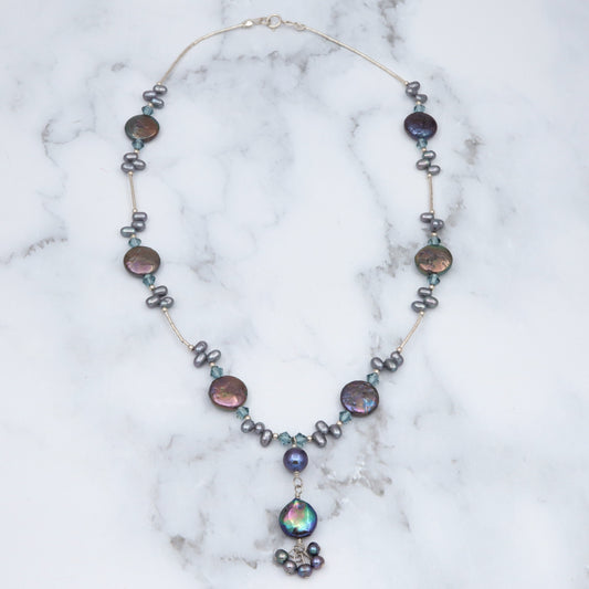 Vintage sterling blue, grey Tahitian pearl & faceted blue glass beaded drop necklace, 17"