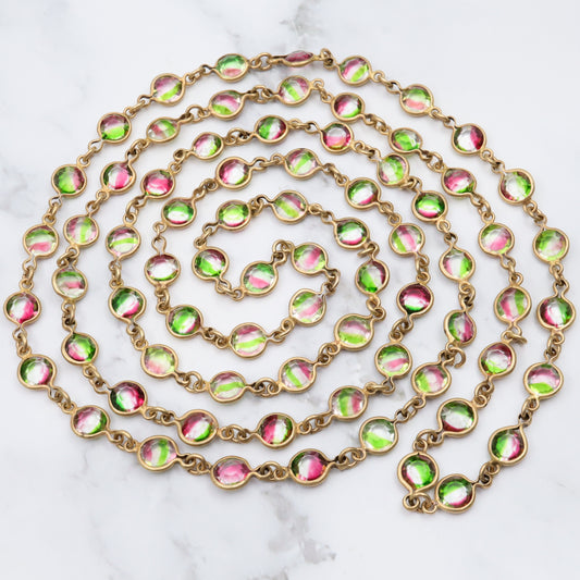 Vintage Austrian watermelon crystal bezel set brass necklace, 46”
